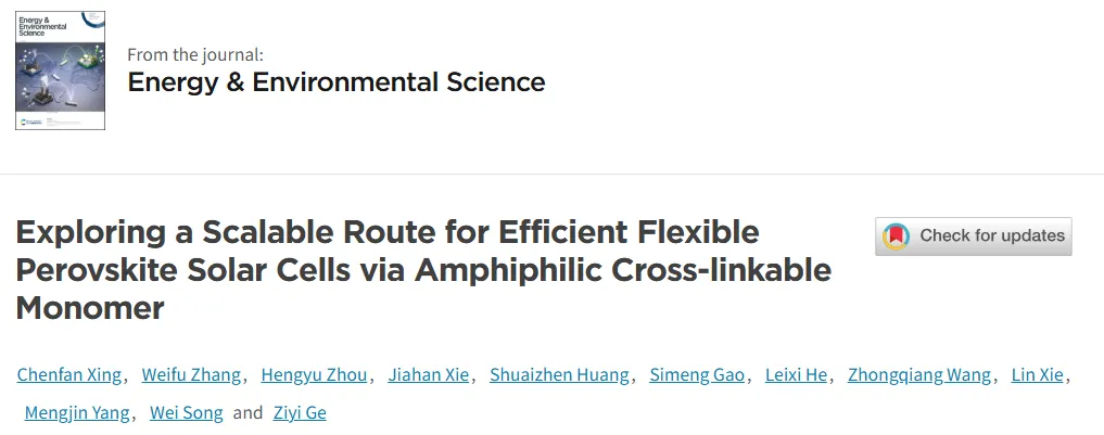 C. Xing, W. Zhang,H. Zhou, J. Xie, S. Huang, S. Gao, L. He, Z. Wang, L. Xie, M. Yang, W. Song and Z. Ge, Exploring a Scalable Route for Efficient Flexible Perovskite Solar Cells via Amphiphilic Cross-linkable Monomer, Energy Environ. Sci.,2026, DOI: 10.1039/D5EE07050C.