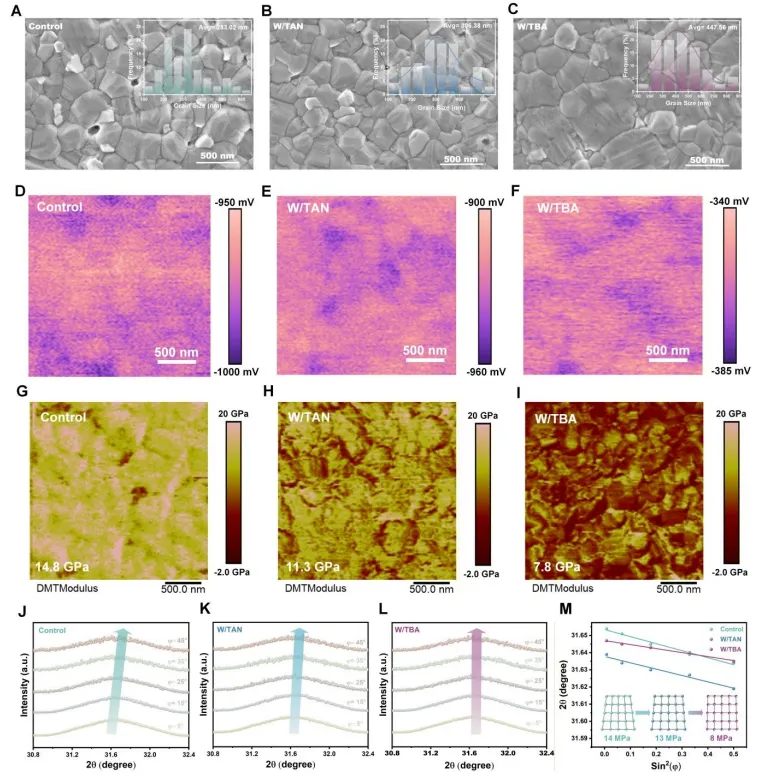 图2. 钙钛矿薄膜的形貌与力学性能。(A–C)对照组(A)及分别添加TAN(B)和TBA(C)的钙钛矿薄膜在PEN/ITO基底上的俯视SEM图像及相应晶粒尺寸分布。(D–F) 对照组(D)、TAN改性(E)和TBA改性(F)钙钛矿薄膜的KPFM图像。(G–I) 对照组(G)、TAN改性(H)和TBA改性(I)钙钛矿薄膜的杨氏模量。(J–L) 对照组(J)及TAN(K)和TBA(L)改性钙钛矿薄膜在0.5°入射角下的GIXRD谱图。(M) 对应的2θ–sin²φ线性拟合。