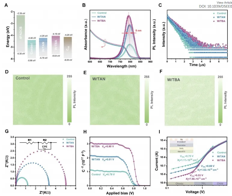 图3. 载流子动力学与非辐射复合过程。(A) PSCs的能级图。(B) 钙钛矿薄膜的紫外-可见吸收光谱与稳态PL光谱。(C) 沉积在玻璃上的钙钛矿薄膜的TRPL衰减曲线。(D–F) 对照组(D)、TAN改性(E)和TBA改性(F)钙钛矿薄膜的PL mapping图。(G) 器件的Nyquist图。(H) 器件的Mott–Schottky图。(I) 单电子器件SCLC测量的暗态J–V曲线。