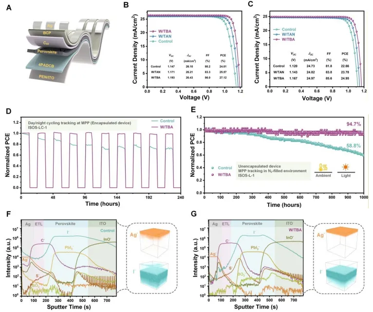 图4. 小面积器件的光伏性能与稳定性。(A)柔性钙钛矿太阳能电池(f-PSC)的器件结构。(B) 刚性PSC的J–V曲线。(C) 柔性PSC的J–V曲线。(D) f-PSC在连续光照与昼夜循环模式下的工作稳定性。(E) 在100 mW cm⁻² LED连续光照下进行最大功率点(MPP)追踪测试的器件稳定性。(F, G) MPP追踪100小时后的ToF-SIMS深度分布图及对应的三维重构结果:(F) 对照器件,(G) TBA改性器件。