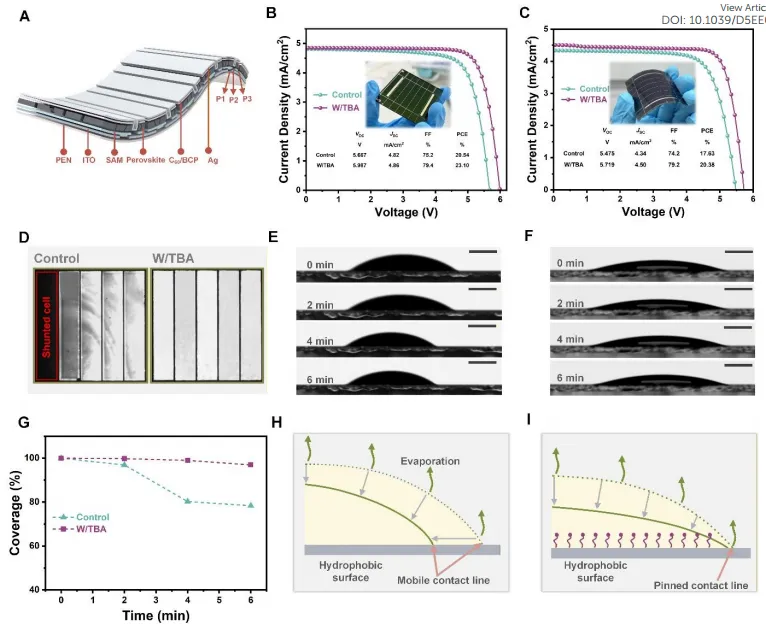 图5. 对疏水基底的润湿性改善与可扩展制备潜力。(A) 微型模组的结构示意图。(B) 最佳刚性微型模组的J–V曲线。(C) 最佳柔性微型模组的J–V曲线。(D) 对照与TBA改性微型模组的EL成像图。(E, F) 钙钛矿墨滴在疏水基底上于环境条件下的干燥过程:(E) 无TBA,(F) 含TBA。(G) 干燥过程中钙钛矿墨滴覆盖率的演变。(H) 墨滴在疏水基底上干燥收缩的示意图。(I) 两亲可交联单体“钉扎”效应的示意图。