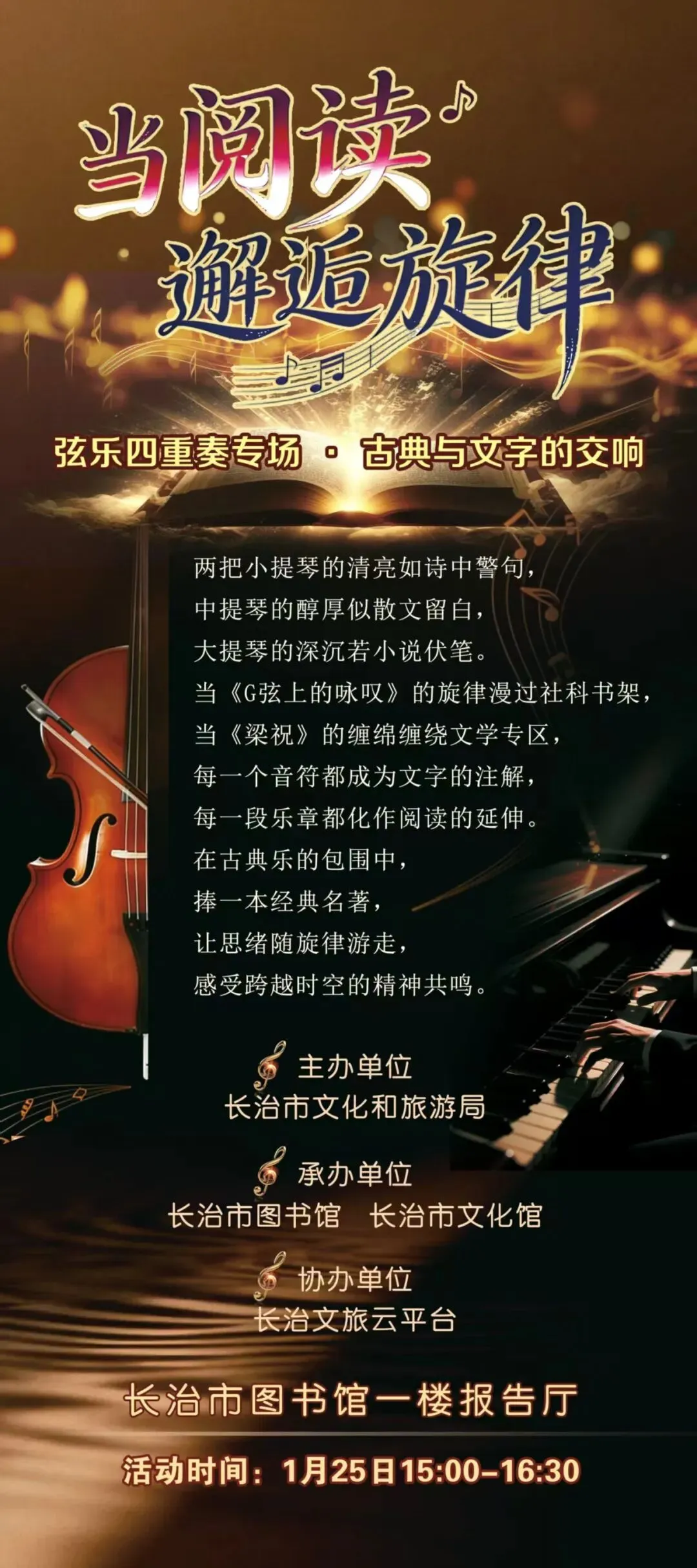 作为2026年长治新春“在太行山上过大年”系列活动之一,这场音乐会打破了传统演出的边界:在书架环绕的报告厅里,让墨香浸润弦乐的细腻质感。当古典旋律撞上文字的温度,每一段乐章都像在翻阅一本流动的书,沉浸式体验直接拉满!