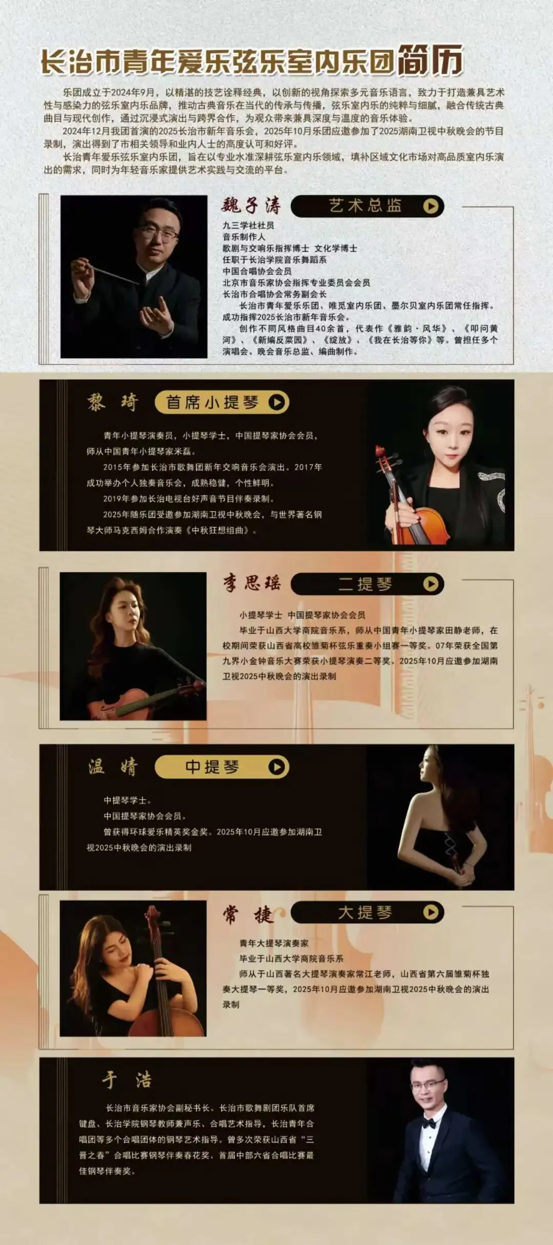 特邀2024年成立的新锐乐团——长治市青年爱乐弦乐室内乐团,用精湛技艺演绎经典曲目,既有传统古典的厚重,又有现代创作的灵动,让你在弓弦交错间感受音乐的深度与温度!