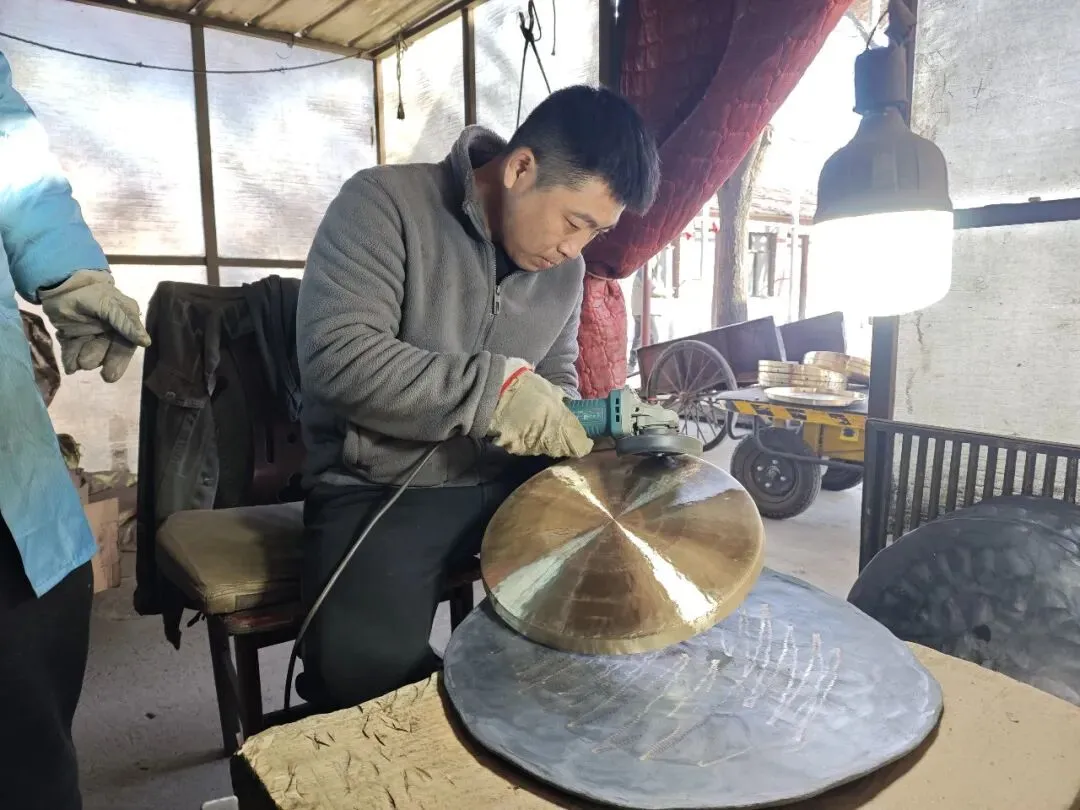“每年都有学员来免费学习,经过系统培训和师傅言传身教,多数可以熟练掌握乐器锻造的工序。”郭岩峰介绍。响铜乐器以铜、锡为主要原料,制作工序繁复精密,需历经配料铸胚、高温锻打、热压成型、热处理、冷整形、抛光、定音7道核心工序。其中,以“千锤打锣,一锤定音”的定音技术最为关键,分毫之差便会影响乐器音质,考验着匠人的耳力、手感与经验。