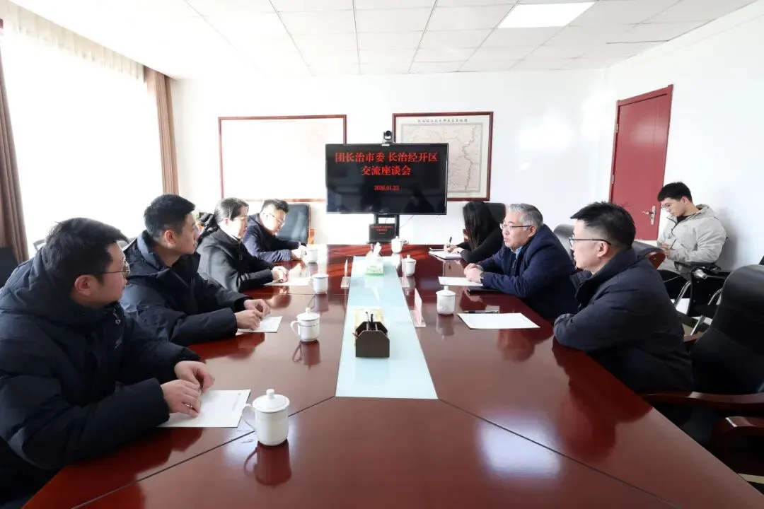 日前,长治经开区党工委书记、管委会主任高鹏与共青团长治市委书记高佳一行开展工作座谈,双方就青年企业家服务产业发展、青年创新创业等进行深入交流。