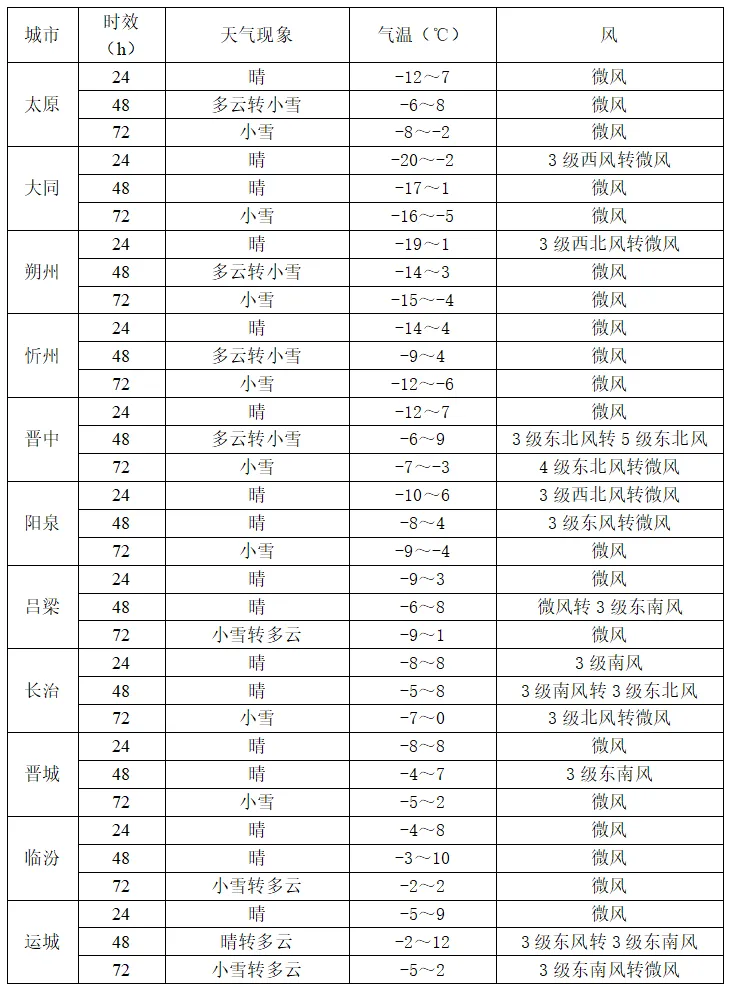 - 最低气温:高寒地区冷到约-23℃,北部及中南部山区-20℃~-12℃,中南部其余地区-12℃~-3℃。