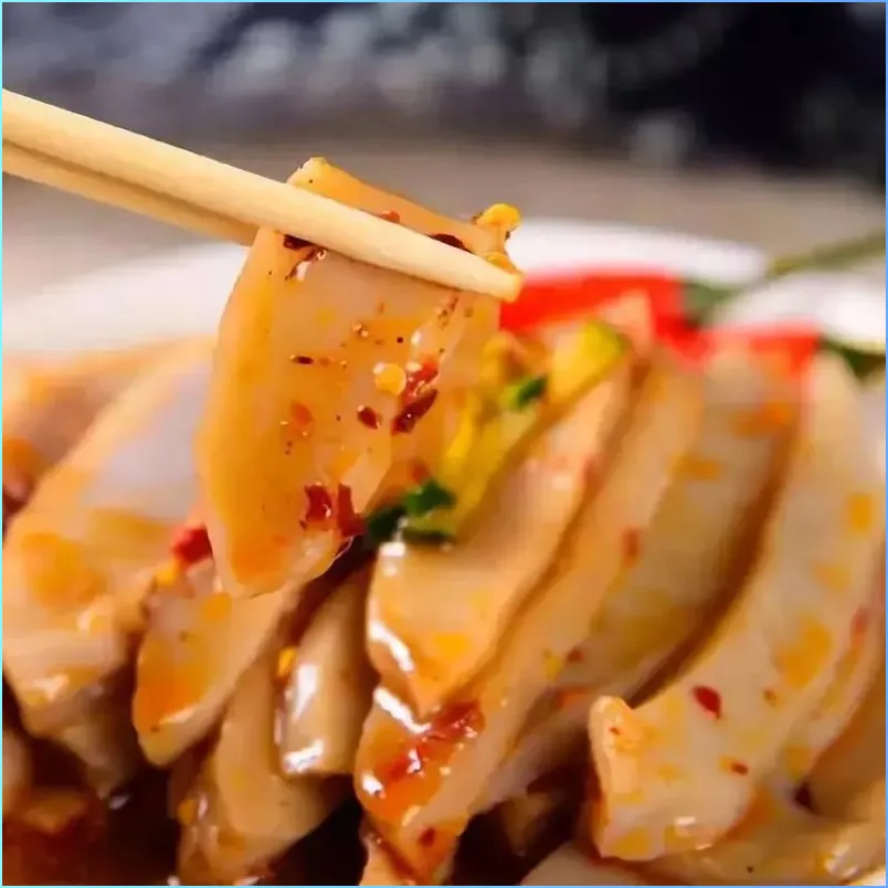 小吃铺子藏在街巷深处,不像景区那样排成一排。碗托铺子在一个不起眼的转角,门脸小,招牌旧,但门口总有人排队。碗托端上来,白白嫩嫩的,切成指甲盖大小的方块,浇上蒜汁、陈醋、辣椒油。夹起一块,碗托滑溜溜的,入口凉凉的,有股淡淡的荞麦香,蒜汁的辣味和陈醋的酸味一起上来,辣是绵绵的辣,酸是亮的酸,像银色的光从味蕾里冒出来。吃完一口,嘴里还留着那股清爽劲儿,让人停不下筷子。