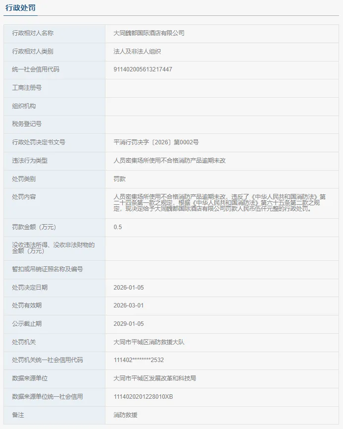 近日,因在人员密集场所使用不合格消防产品逾期未改,大同魏都国际酒店有限公司被大同市平城区消防救援大队依法处以5000元罚款。
