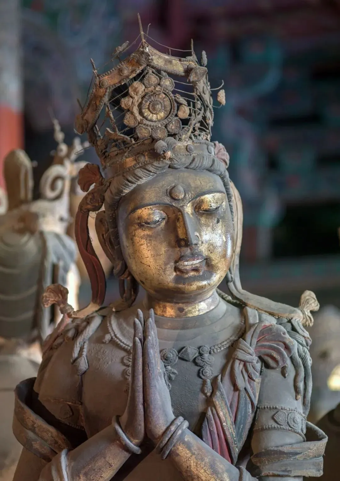 辽代建筑的“天花板”。不用一根钉子的天宫楼阁精巧到让人惊叹,薄如蝉翼的飞天悬塑仿佛下一秒就要飘起来,还有那尊面带微笑的合掌露齿菩萨,温柔到让人瞬间静下心来,千年前的审美与匠心,一眼就能读懂。