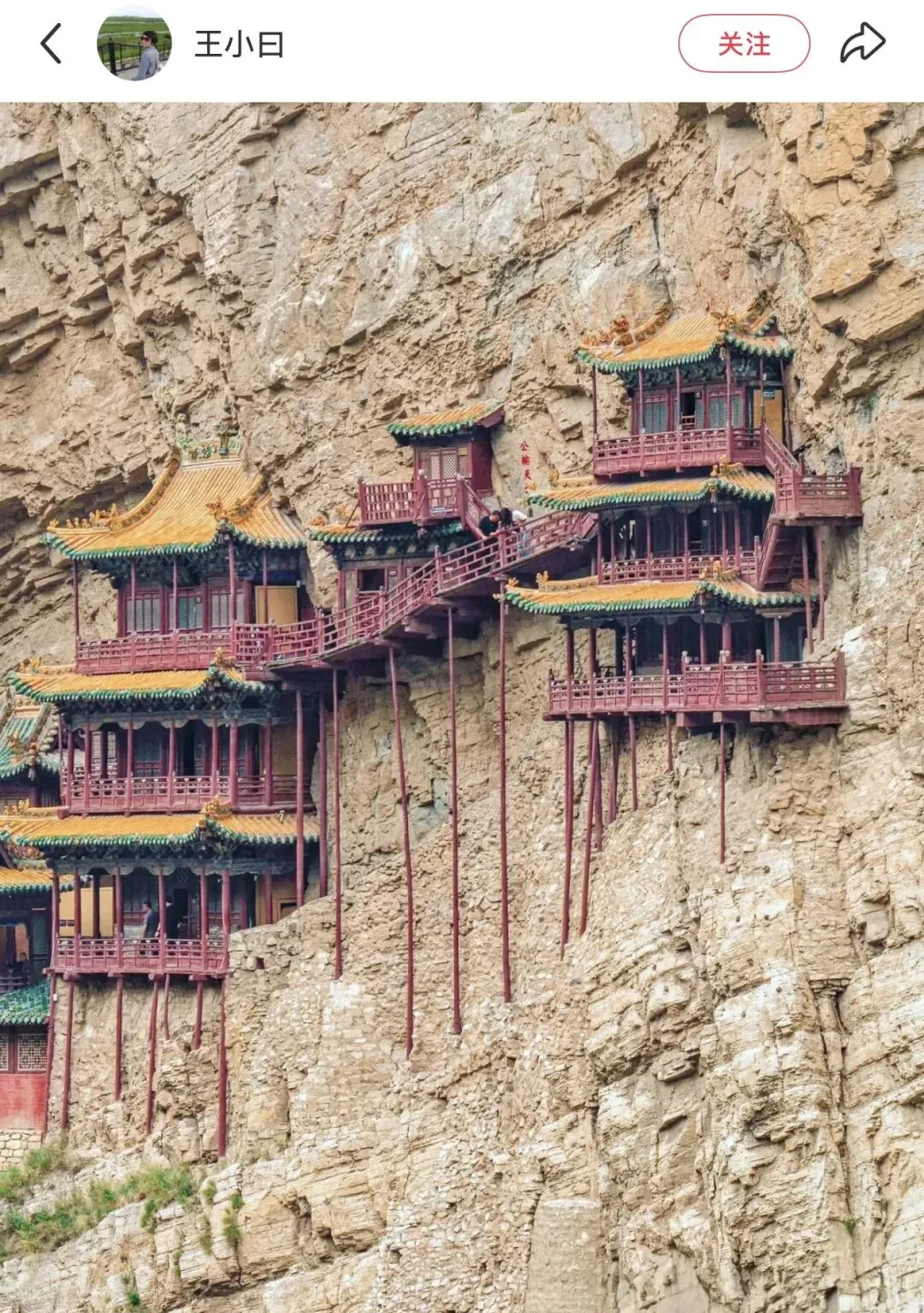 徐霞客笔下的“天下巨观”,悬在恒山悬崖峭壁间,距地面50多米,仅靠几根木柱“挂”了千年,沿着狭窄木梯攀爬,脚下是万丈深渊,手边是千年木梁,那种惊险又震撼的感觉,只有亲自体验才懂。