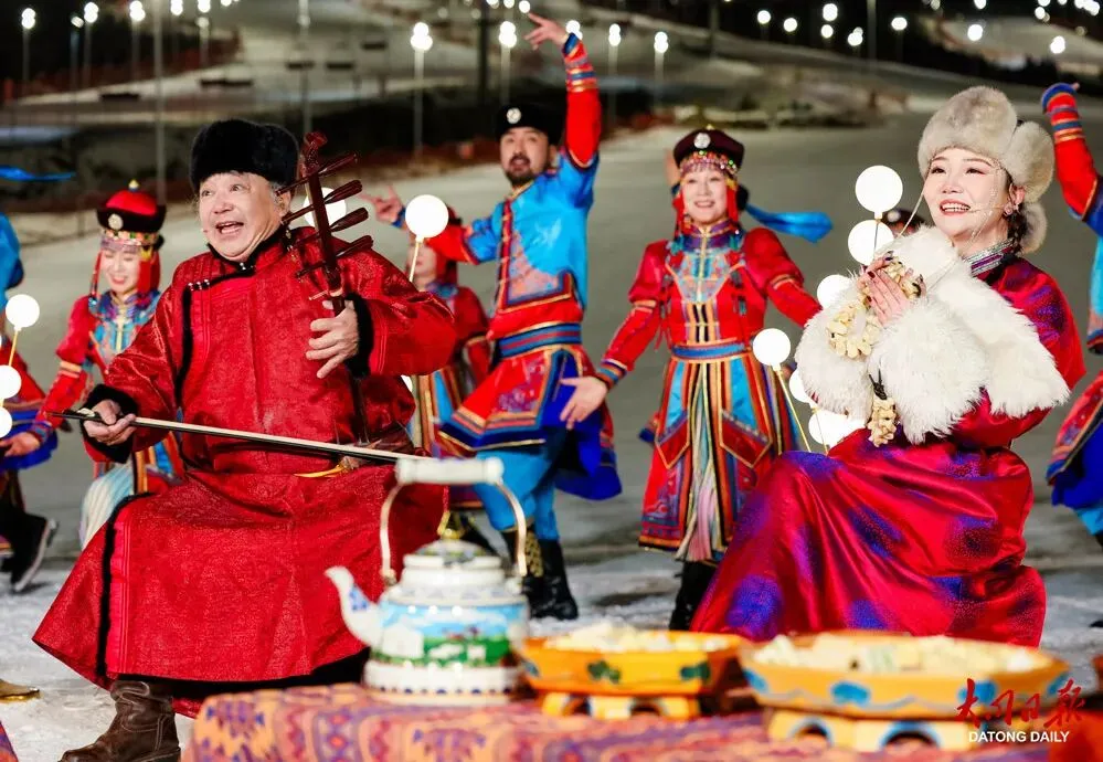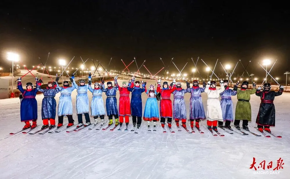 万龙白登山国际滑雪场上,《欢腾的鄂尔多斯》踏雪而歌,传统服饰与冰雪激情碰撞,为冬日大同注入热情活力。