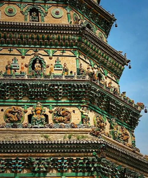 下午回城,去广胜寺。飞虹塔的琉璃在阳光下一层层发光,抬头那一瞬,心会安静。再去看华严寺的木作,辽风端重,屋脊兽目光如炬;绕到九龙壁,明初的釉色在日头下还亮得发透,龙鳞一片片都精神。
