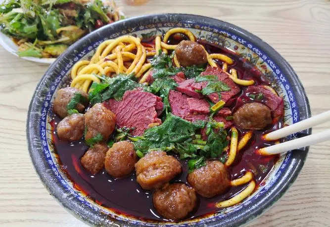 清早,先来一碗牛肉丸子面。红油热,牛油厚,丸子紧实,一口下去从喉咙暖到胃。中午别去找摆拍的店,老城区树荫下的小馆子更对味:黄米蒸饭软糯,裹着红豆沙,最后滚一层白糖,甜得不腻。傍晚回到鼓楼片区,炭火明明灭灭,羊腰、板筋在铁架上滋滋作响,孜然和辣椒交织的味道,勾人。