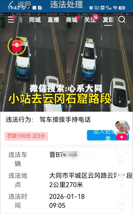 注意!大同这路口接拨手持电话罚款100元 记3分。