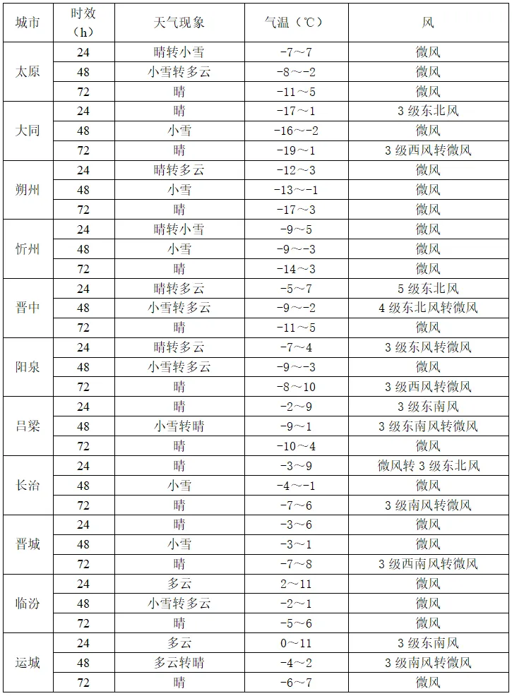 1月25日全省阴天转多云,大部分地区有小雪,大同、朔州等地的局部地区有中雪,中南部部分地区有雾或轻雾。