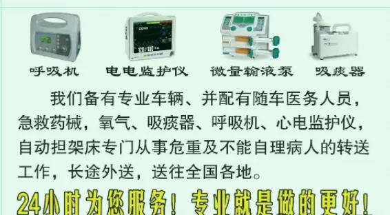 - 动态资质审核:公司建立常态化资质审核与技能提升体系,定期组织医护人员参加最新急救技术、转运规范培训及考核,确保专业能力与行业标准同步更新。我们提供专业的救护车出租服务,涵盖长途转运、跨省转运、市内转运病人服务。专注于为新生儿、骨折病人、重症病人、危重病人提供优质转运服务,也积极协助行动不便者进行复查、转院、转诊。同时,承接跨省转运病人回家、遗体运送回家服务,每一项服务都有专业医护团队支撑,确保安全可靠,预约电话 4001626120,下文看适配设备。