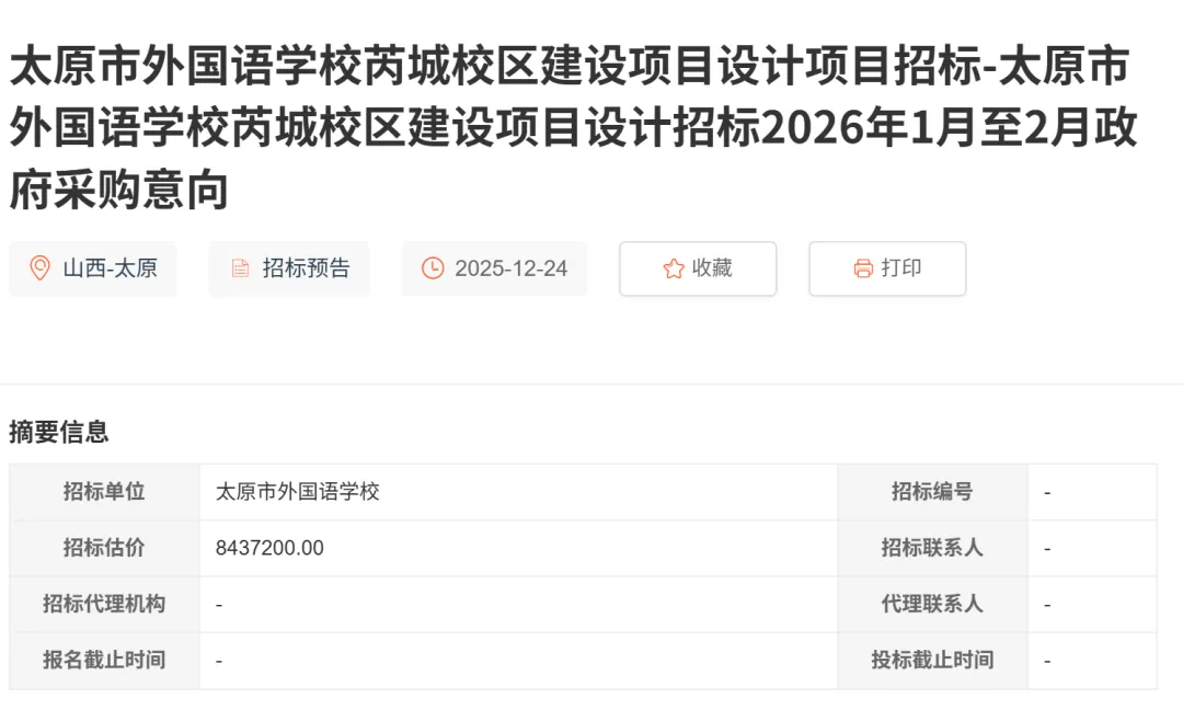 2025 年 12 月,太原市外国语学校芮城校区建设项目设计招标的政府采购意向公告发布,计划在 2026 年 1–2 月进行设计类招标,标志着项目进入实质性的工程设计阶段。