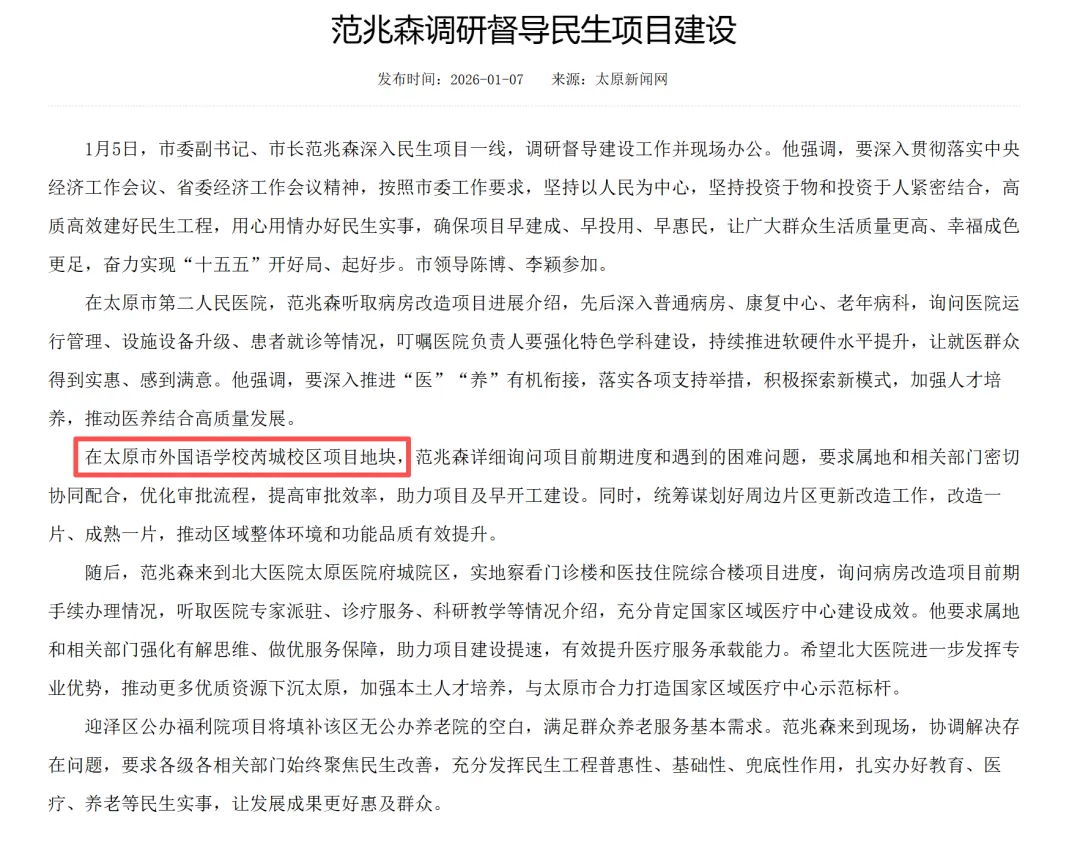 2026 年 1 月初,太原领导在民生项目建设调研督导中,提到了太原市外国语学校芮城校区,并且提出属地和相关部门密切配合,助力项目及早开工建设。