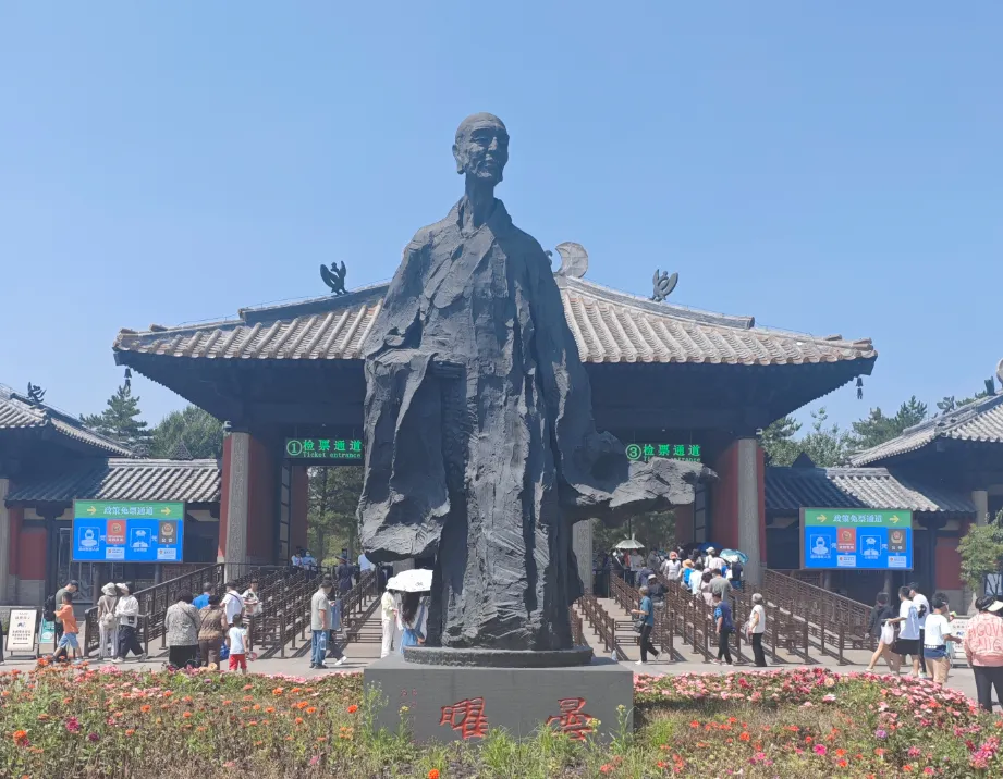 自东门步入景区,宽大的石坝中央塑有昙曜法师的青铜雕像。他身披袈裟,身形清癯,目光深邃,沉静地平视东方,仿佛在用一颗朴素本真之心复活佛法,在时间背后去追求勃郁的生命精神,恢复钝化的生命感觉。
