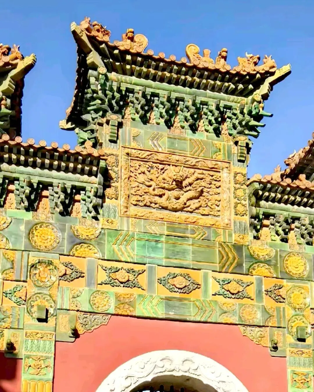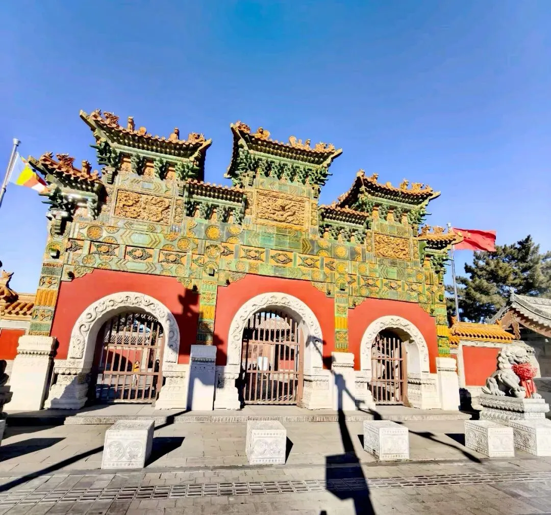 走进法华寺,首先映入眼帘的是一座琉璃牌楼,这是寺的山门 。牌楼翼角翘起,斗拱层叠,黄绿琉璃与草白玉相互映衬,上面云龙等图案组成的饰件绚丽夺目,尽显雍容华贵 。