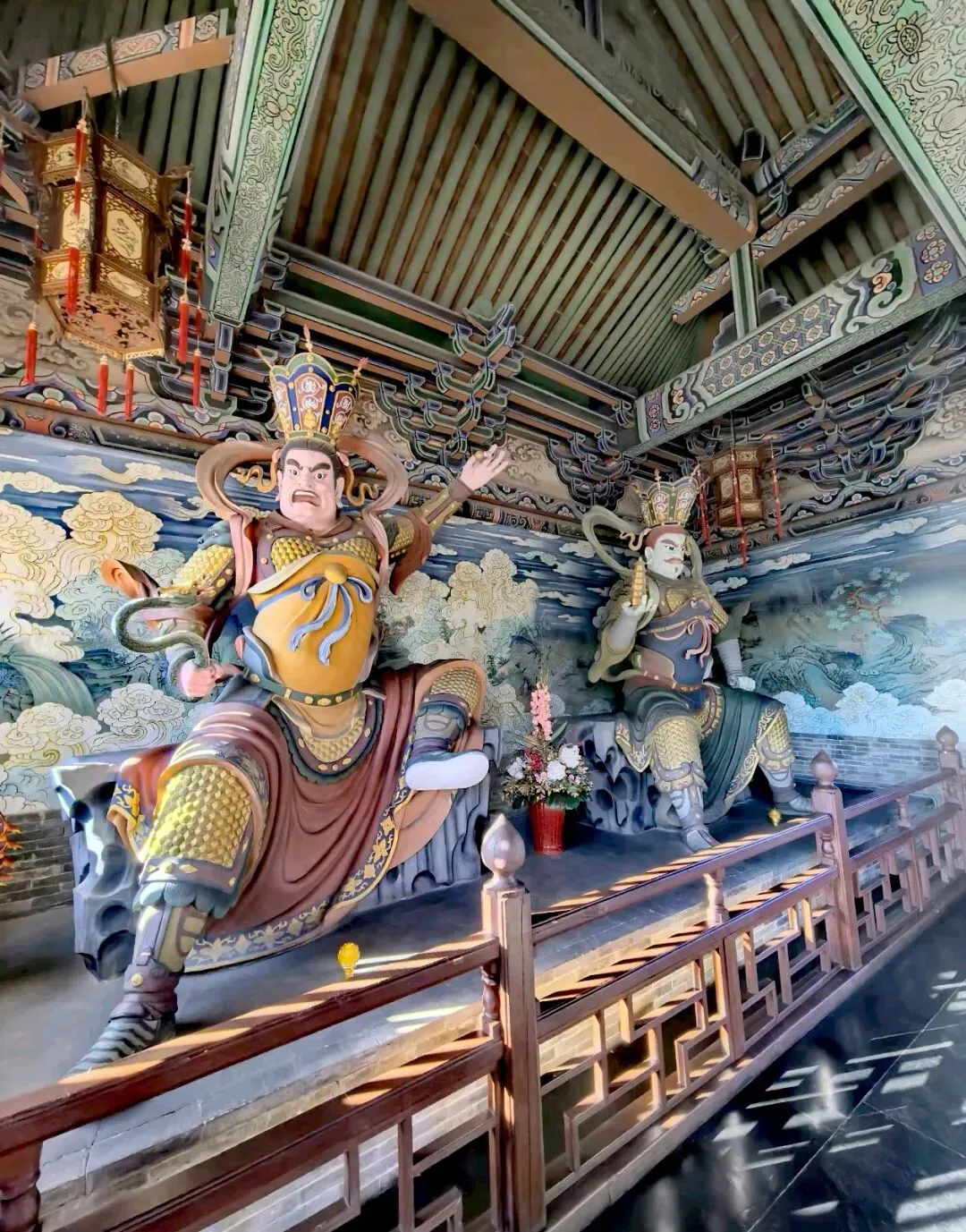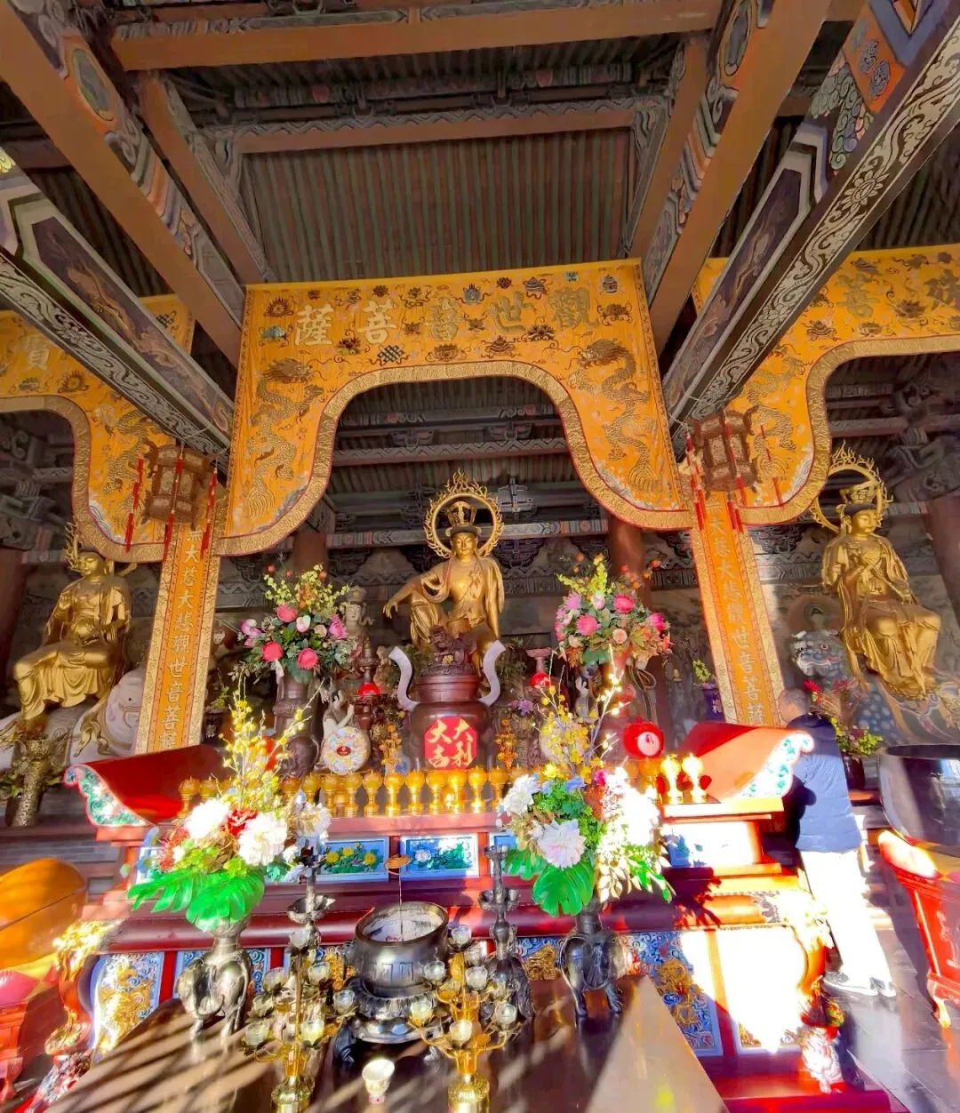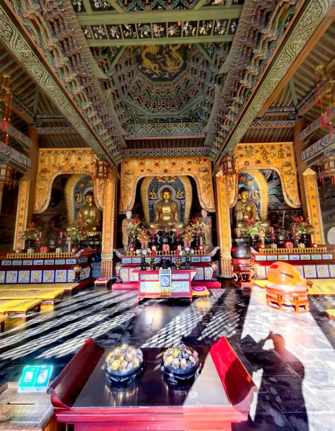 大雄宝殿是法华寺的主殿,殿内供奉着“三身佛”,背光采用悬塑并绘有石绿、深蓝等颜色,立体感极强,山墙绘有水陆壁画,人物众多、形态各异 。