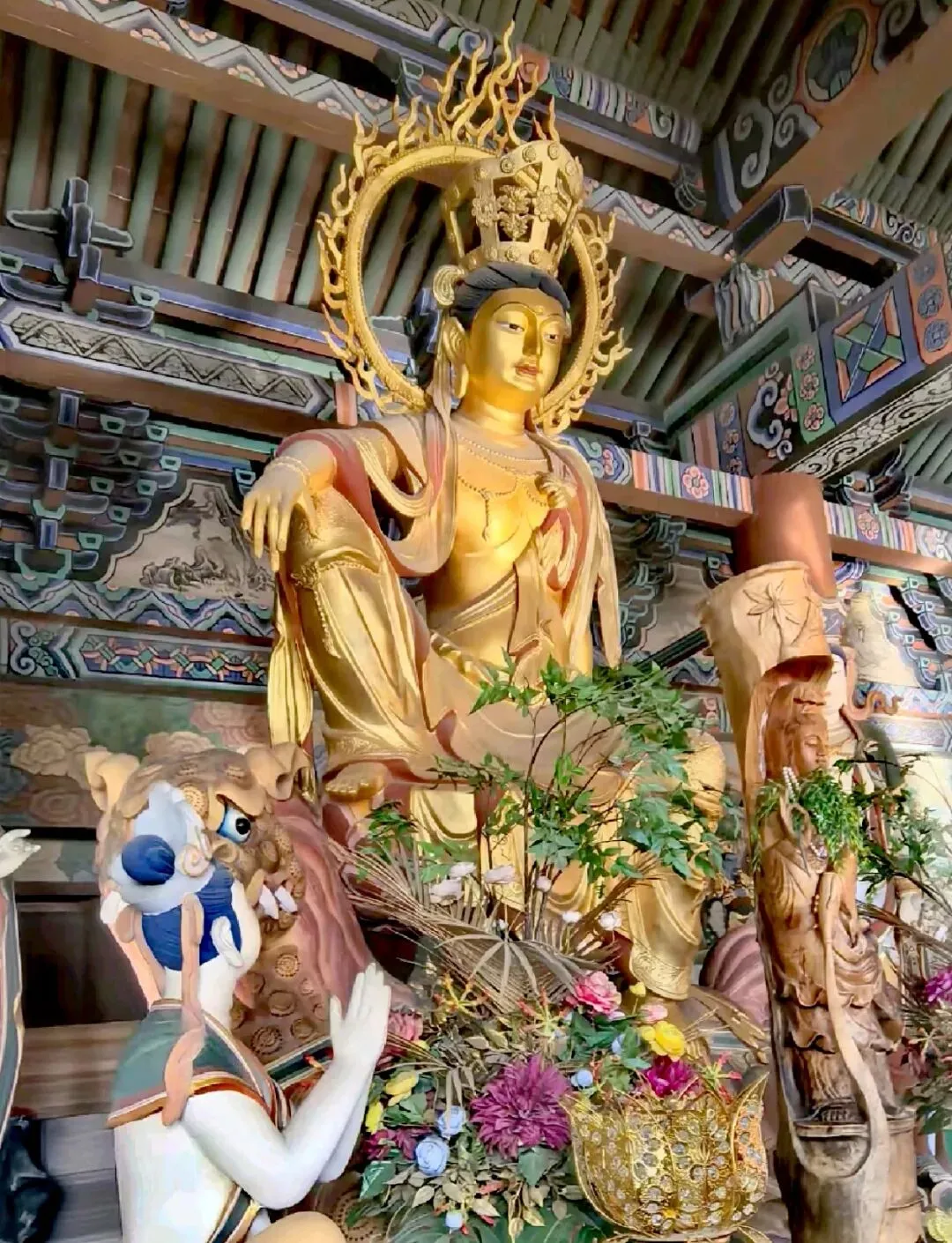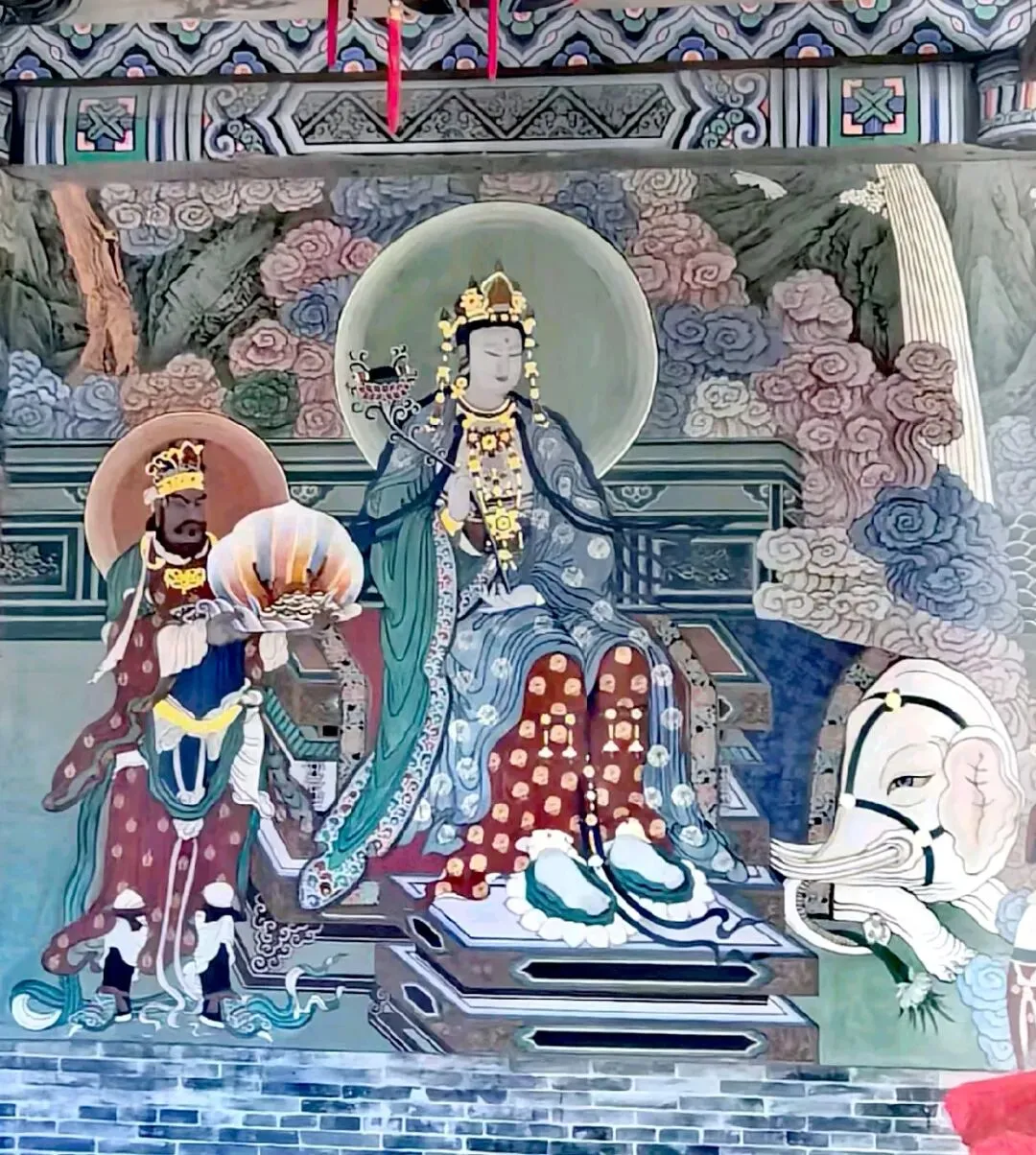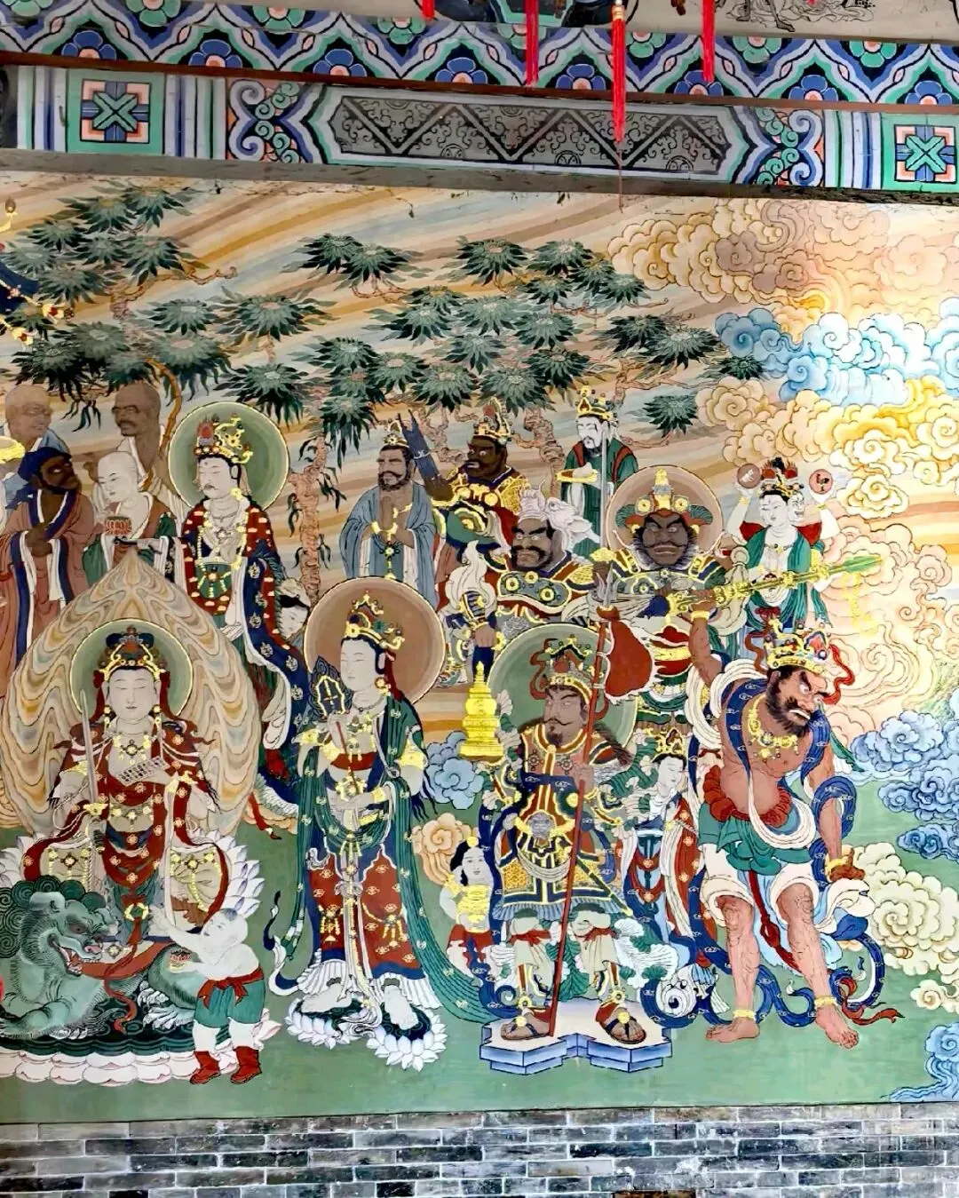三大士殿内供奉着观音、文殊、普贤三大士菩萨,塑像面容祥和,东西壁绘有八大菩萨、十方佛,后壁绘有法华法会场景 。