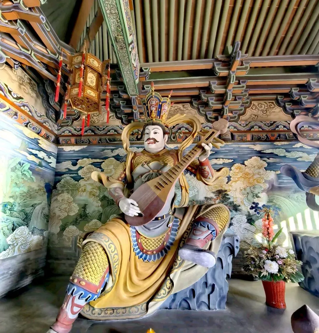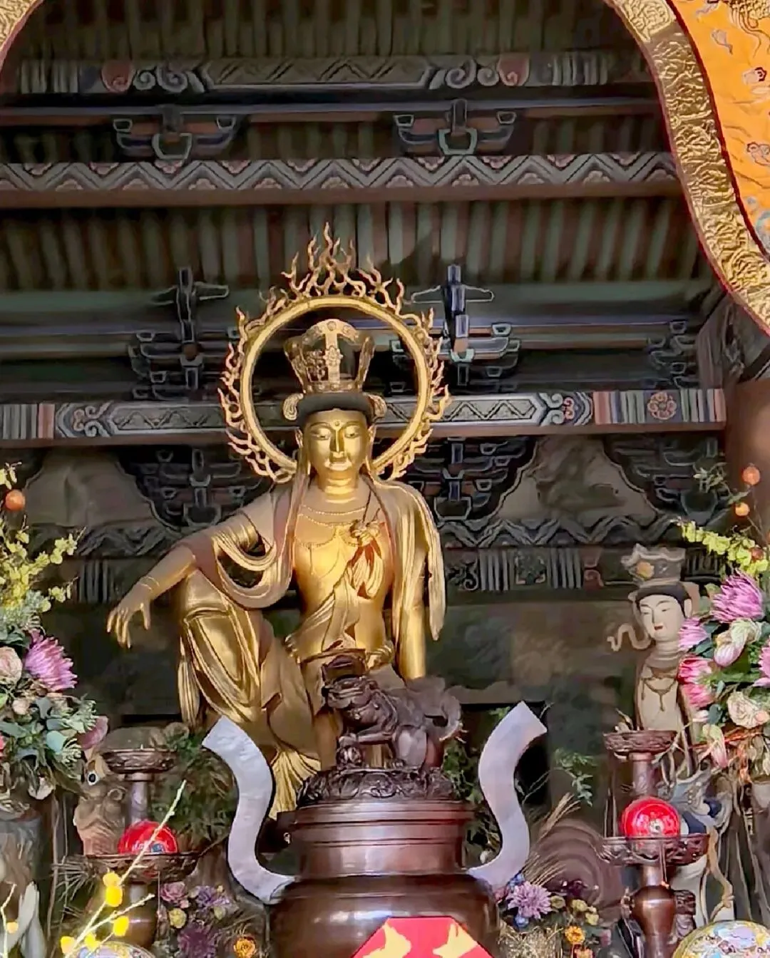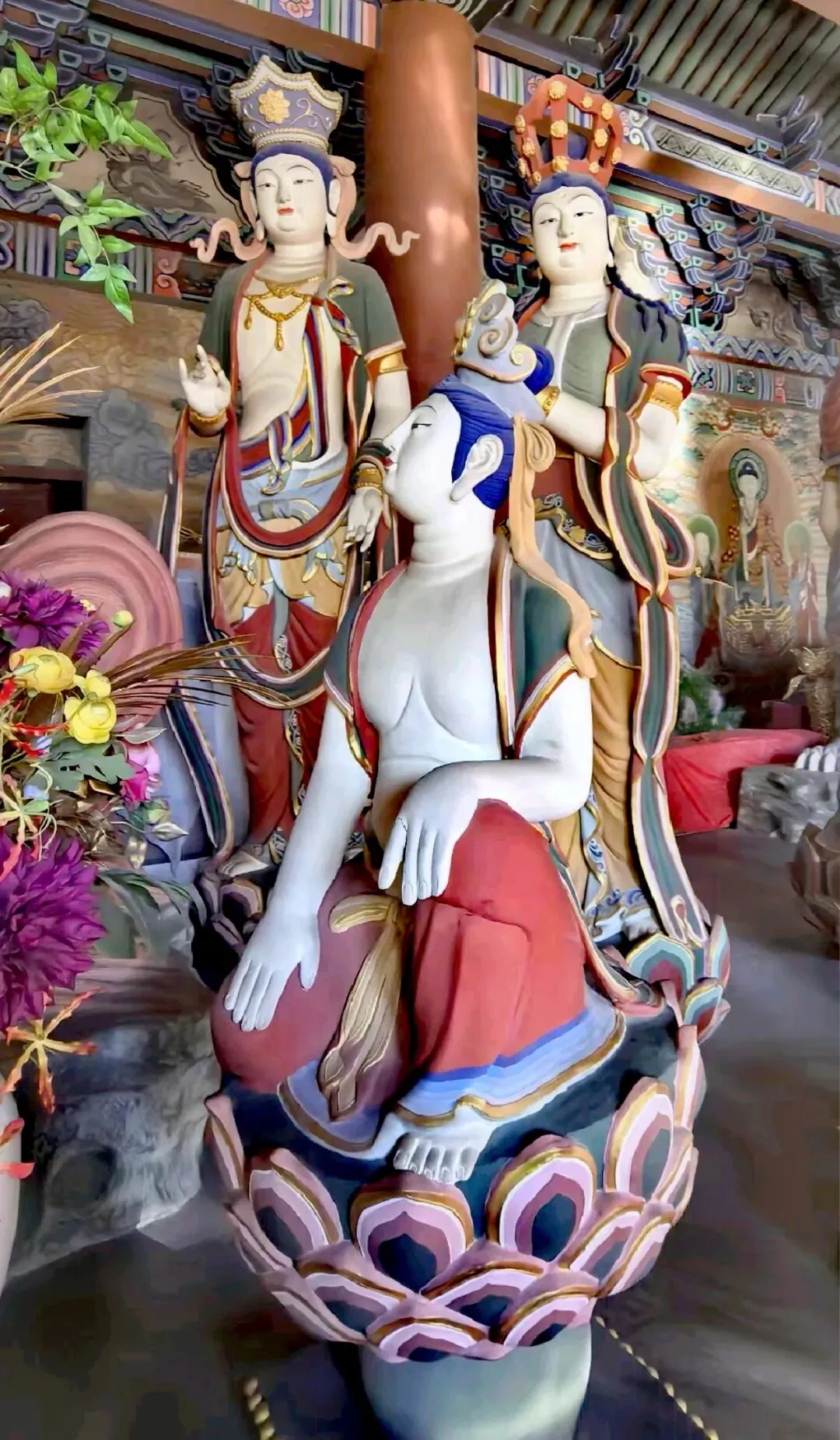 三大士殿内供奉着观音、文殊、普贤三大士菩萨,塑像面容祥和,东西壁绘有八大菩萨、十方佛,后壁绘有法华法会场景 。