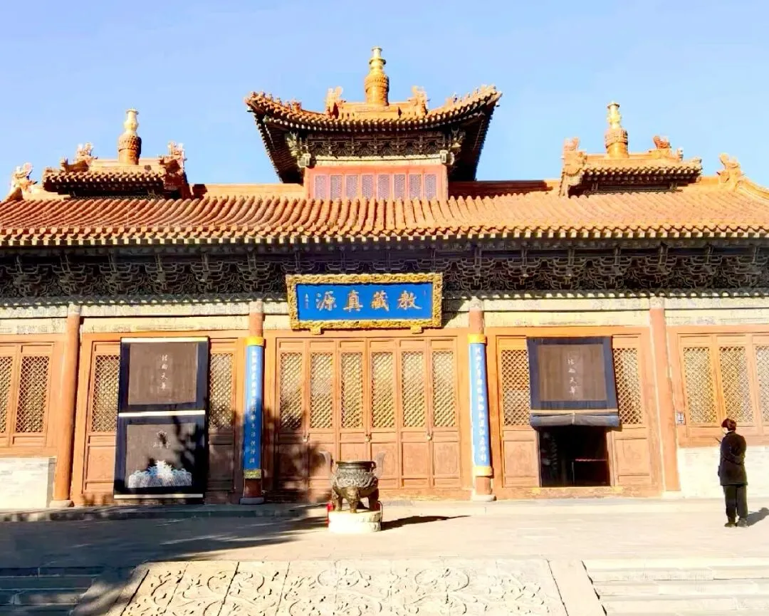 藏经楼位于寺院的最后方,采用藏式风格建筑。楼内珍藏着许多珍贵的佛教经典和文物,其中最引人注目的是当代书画僧万德法师刺血楷写的四座大幅经塔——《法华经》《楞严经》《金刚经》《无量寿经》和一座被认定为吉尼斯世界纪录的巨幅《华严经》塔经 。