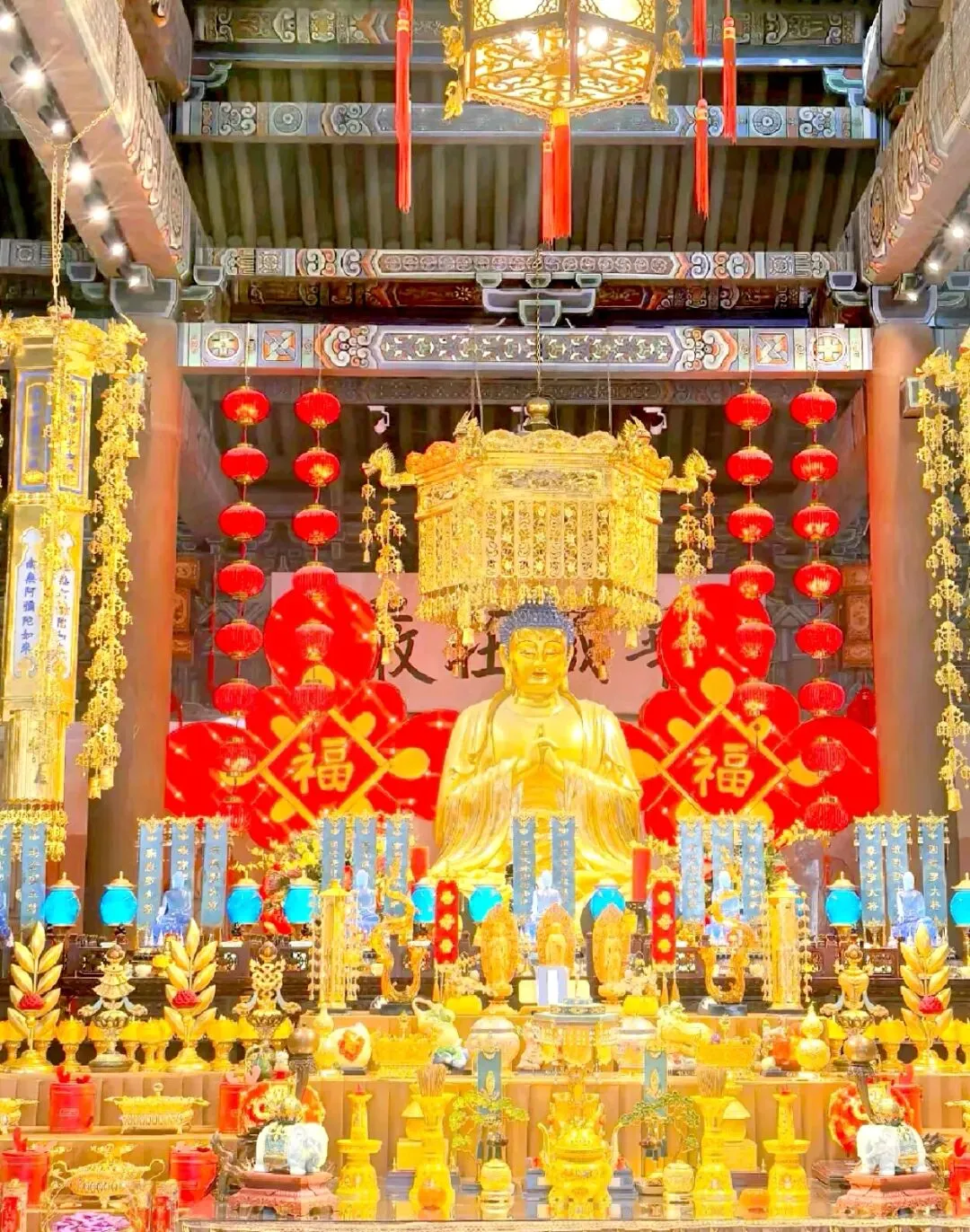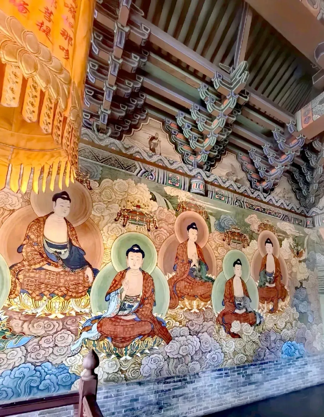 沿中轴线向北,依次是天王殿、三大士殿、大雄宝殿、法华塔、藏经楼。天王殿内塑有弥勒佛、韦陀以及风调雨顺四大天王,壁画以祥云、荷花等为题材,将佛教文化与传统儒家、道家文化巧妙结合 。