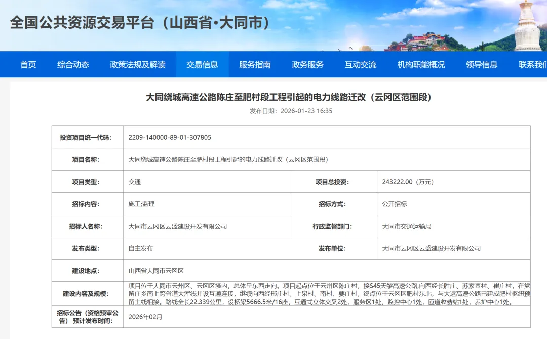 项目位于大同市云州区、云冈区境内,总体呈东西走向。项目起点位于云州区陈庄村,接S45天黎高速公路,向西经长胜庄、苏家寨村、崔庄村,在党留庄乡南上跨省道大浑线并设互通连接,继续向西经邢庄村、上泉村、南村、要庄村,终点位于云冈区肥村东北,与大运高速公路已建成肥村枢纽预留主线相接。路线全长22.339公里,设桥梁5666.5米/16座,互通式立体交叉2处,服务区1处,监控中心1处,匝道收费站1处,养护中心1处。招标公告(资格预审公告) 预计发布时间: