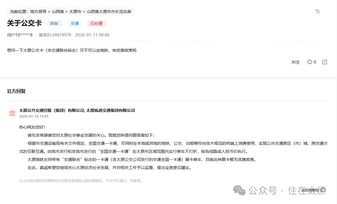 近日,有网友:在领导留言板发起了关于太原公交卡能否乘坐地铁的咨询: