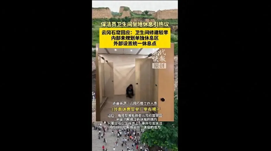 近日,有网友发帖称在位于山西大同的云冈石窟景区,一名保洁阿姨没有休息的地方,只能坐在卫生间地上,引发关注,网友呼吁给阿姨安排个休息的地方。