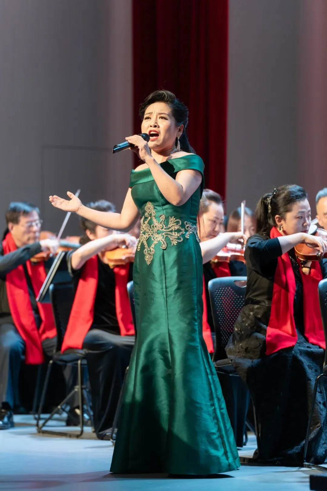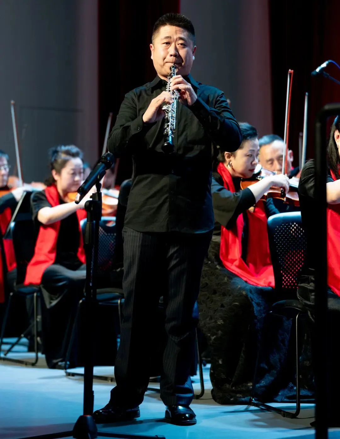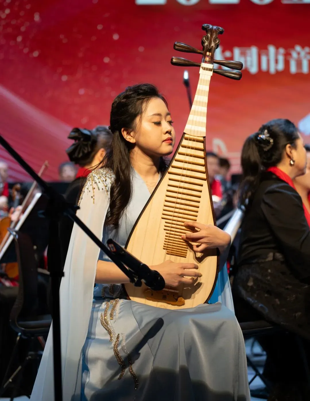 《地道战组曲》《红歌联奏》《我的祖国》《钢铁洪流进行曲》等红色经典轮番奏响,雄浑旋律勾勒家国情怀,让观众热血沸腾;随后,指挥棒交至康小凡手中,法国经典《阿莱城姑娘》尽显西洋管弦乐的浪漫雅致,双簧管协奏曲《花儿为什么这样红》以独特音色演绎经典旋律,余韵悠长;王丽娟与樊晓雨林携手带来琵琶协奏曲《草原英雄小姐妹》,铮铮乐声讲述英雄故事,勾勒出苍茫草原的动人意境。