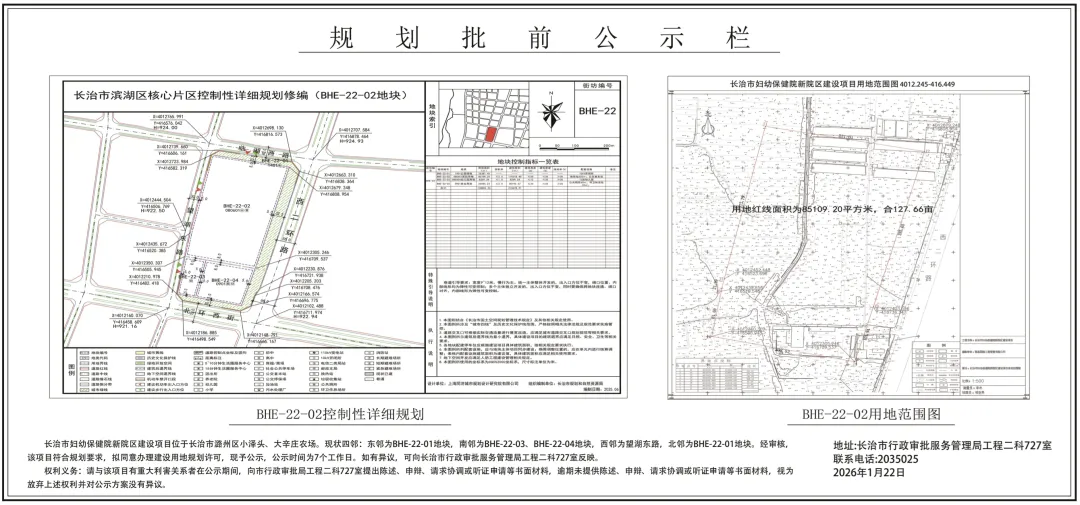 长治市妇幼保健院新院区建设项目位于长治市潞州区小泽头、大辛庄农场。现状四邻:东邻为BHE-22-01地块,南邻为BHE-22-03、BHE-22-04地块,西邻为望湖东路,北邻为BHE-22-01地块。经审核,该项目符合规划要求,拟同意办理建设用地规划许可,现予公示,公示时间为7个工作日。如有异议,可向长治市行政审批服务管理局工程二科727室反映。