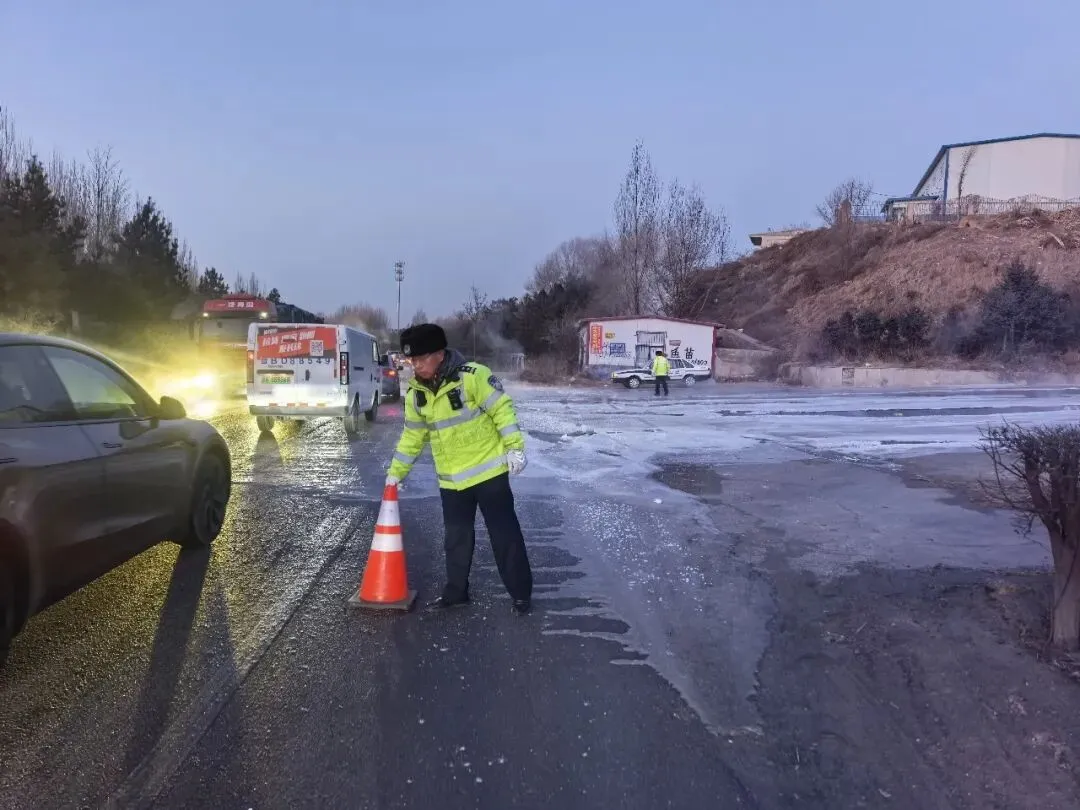 清晨,109国道姜家湾路段突发暖气管爆裂事故,零下25度的低温让泄漏热水迅速凝结,形成近百米大面积结冰带,半小时内接连发生多起机动车单方事故,道路通行秩序受严重影响。交管六大队指挥中心接110警情后,立即指派值班警力赶赴现场,在事故路段两端设置警示标志与反光锥桶、划定警戒区域,安排专人分点疏导交通,引导车辆减速有序通行,严防拥堵和二次事故。同时快速联动市政、供热等部门,对破损暖气管临时封堵,清理结冰路面。处置中,民警还在通勤车队微信群发布路况提示,向过往驾驶员详细说明路面情况和绕行路线,提醒谨慎驾驶、保持安全车距。经紧张作业,结冰路面彻底清理,破损管线妥善处理,道路恢复正常通行。