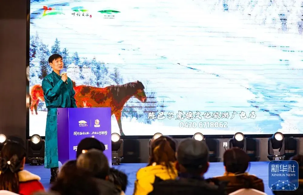1月21日下午,呼伦贝尔根河市文旅推荐官在推介会上分享当地文旅资源和民俗风情。