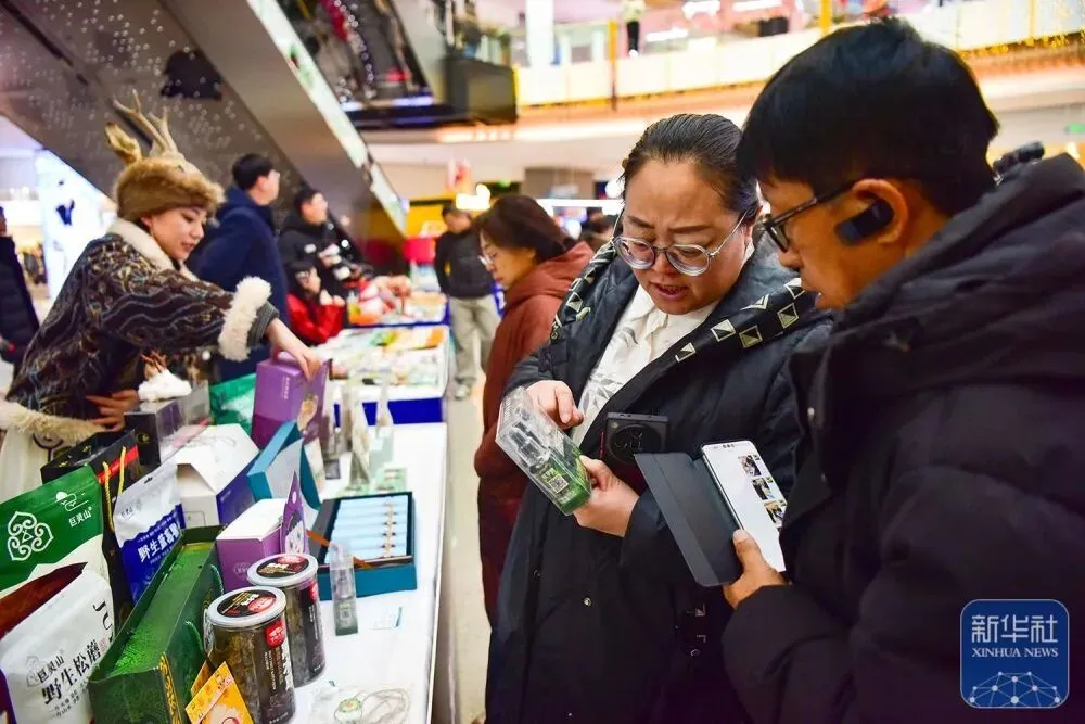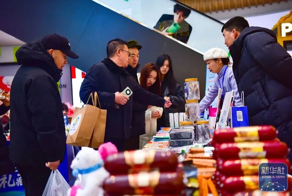 1月21日下午,大同市民、游客在呼伦贝尔大草原推介会现场购买特色食品。