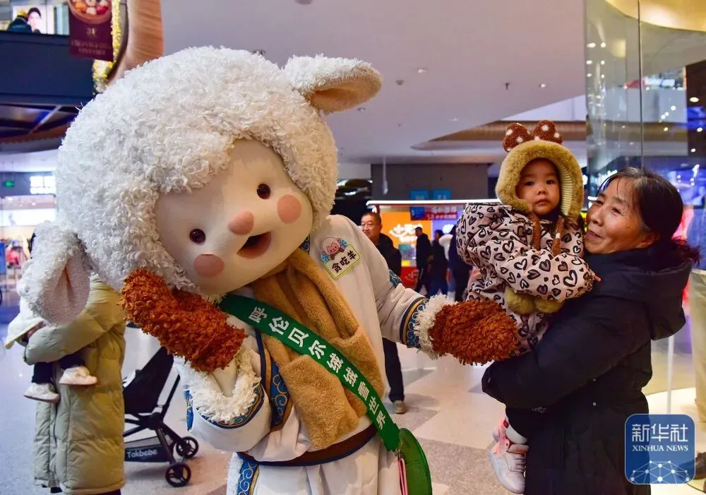 1月21日下午,呼伦贝尔大草原推介会主持人、呼伦贝尔绒绒雪世界吉祥物“呼伦小羊”与大同市民互动。