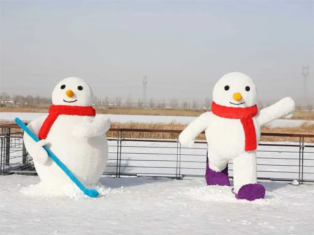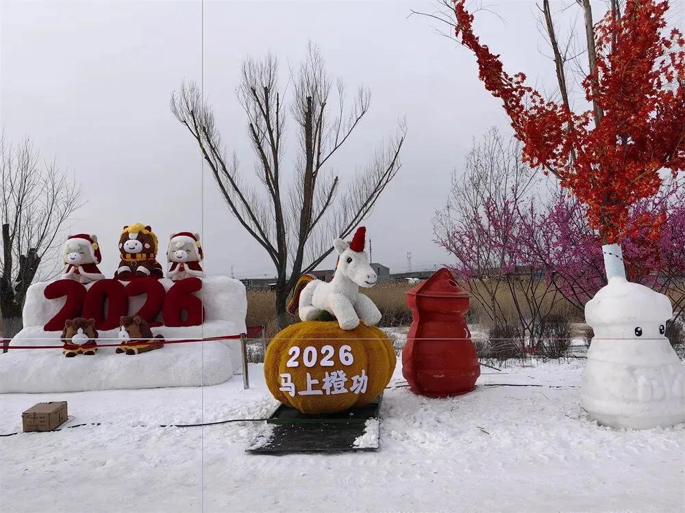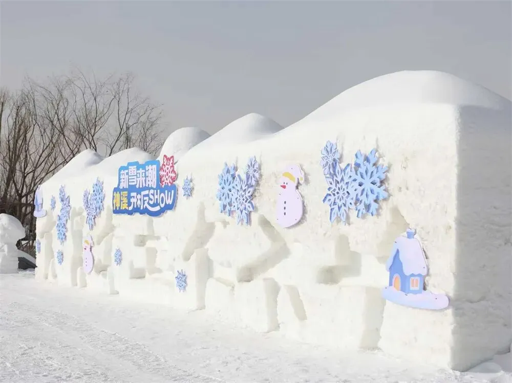 本届冰雪节依托山西神溪国家湿地公园的生态优势,在园内打造了1000米人工造雪雪道与9500平方米冰上娱乐场两大核心体验区。步入公园,“新雪来潮 神溪开板Show”主题拱门首先映入眼帘,两侧巨型雪人头戴醒狮帽、手持春联,拱门后便是1000米雪道,憨态可掬的雪人在两侧列队相迎;雪道旁的树木也换上新装,树干裹着彩色针织“毛衣”,宛如一场别致的冬日时装秀;沿着步道前行,“爱在冬天”主题雪人、马年专属“马上橙功”装置、巨型粉色玫瑰熊、“嗨!浑源”热气球等十余处网红打卡点依次铺展,让游客在银装素裹中收获满满的情绪价值,随手一拍就是大片。