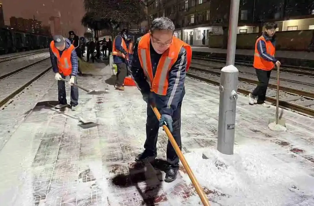 近日,寿阳营业部铁路货场受降雪影响出现积雪覆盖,为保障货物装卸作业安全与运输通道畅通,营业部迅速启动扫雪除冰应急预案,组织人员开展除雪作业。作业人员手持铁锹、扫帚等工具,分区域对货场通道、装卸线积雪集中清理,对易结冰地段及时撒布防滑盐。全体人员通力协作完成重点区域积雪清扫,开辟安全作业通道,有效消除雪天作业安全隐患,为冬季铁路物流畅通筑牢基础。