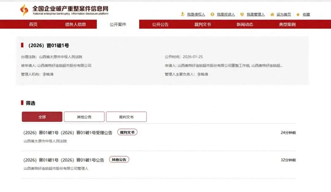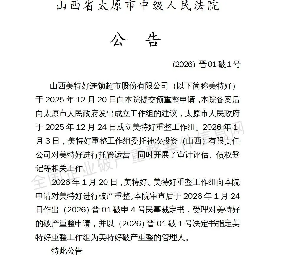 重整管理人公告显示,除了提及重整工作组作为美特好破产重整的管理人外,还指出将继续委托神农投资(山西)对美特好进行托管运营;原美特好储值卡使用办法按照2026年1月12日发布的公告继续执行;债权人应于2026年3月31日前,向管理人申报债权。对于神农科技集团托管美特好,山西省国资委曾表示,“神农美特好”的焕新开业及原储值卡有序使用等事宜,直接关系到千家万户的日常生活与消费信心,是对神农集团作为国有企业履行社会责任、形成经营合力的一次重要考验,要确保商品供应、价格优惠及服务质量。省国资委对此高度重视,将积极指导协调,共同应对挑战,切实保障群众利益与企业平稳运营。一、 投融资合作信息: