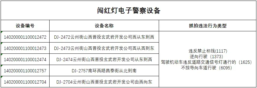 为了进一步规范道路交通秩序,有效遏制道路交通事故的发生,减少道路交通违法行为,净化道路交通环境,根据《中华人民共和国道路交通安全法》及其实施条例以及公安部《道路交通安全违法行为处理程序规定》等法律法规有关规定,并结合道路实际状况,大同市公安局交通管理支队现决定启用5处交通违法电子警察抓拍设备,将对机动车闯红灯、压线、不按导向车道行驶、逆行等违法行为进行抓拍取证并依法实施行政处罚。