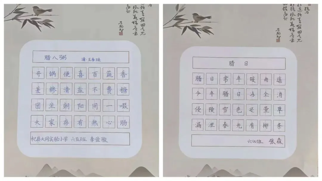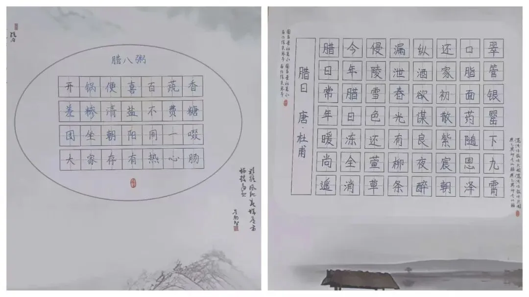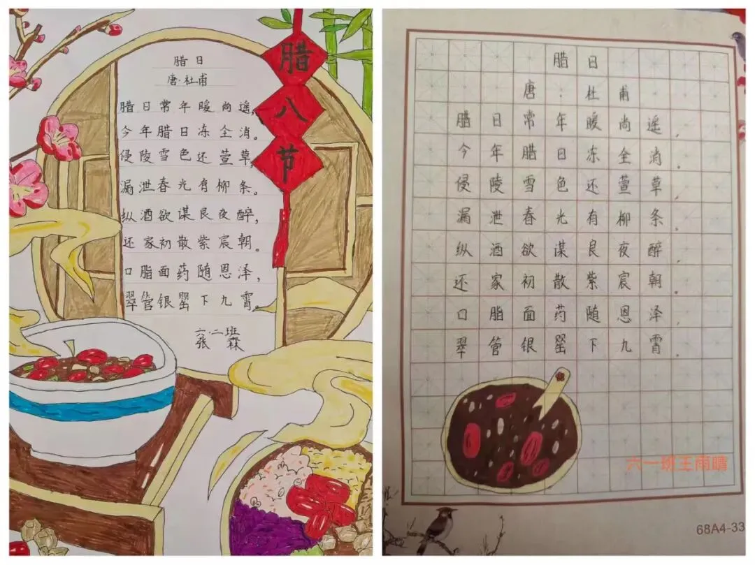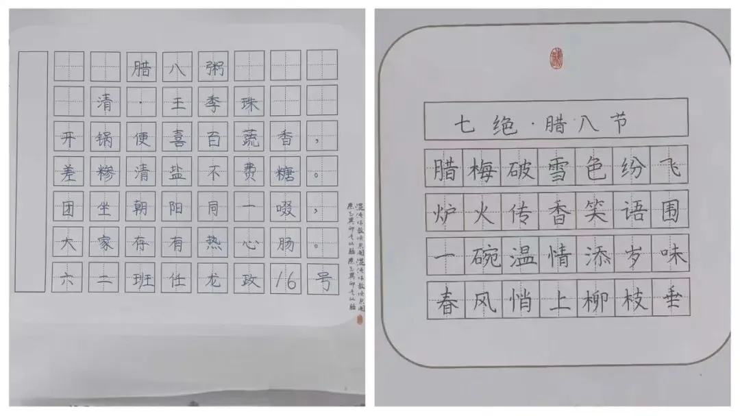 笔墨书写间,流淌文化情;朗朗诵读声,传递古典韵。同学们或执笔静心书写经典腊八诗篇,或朗诵朗朗上口的腊八诗词童谣。一撇一捺,书写着对佳节的美好祝愿;一字一句,浸透着对传统文化的敬意。