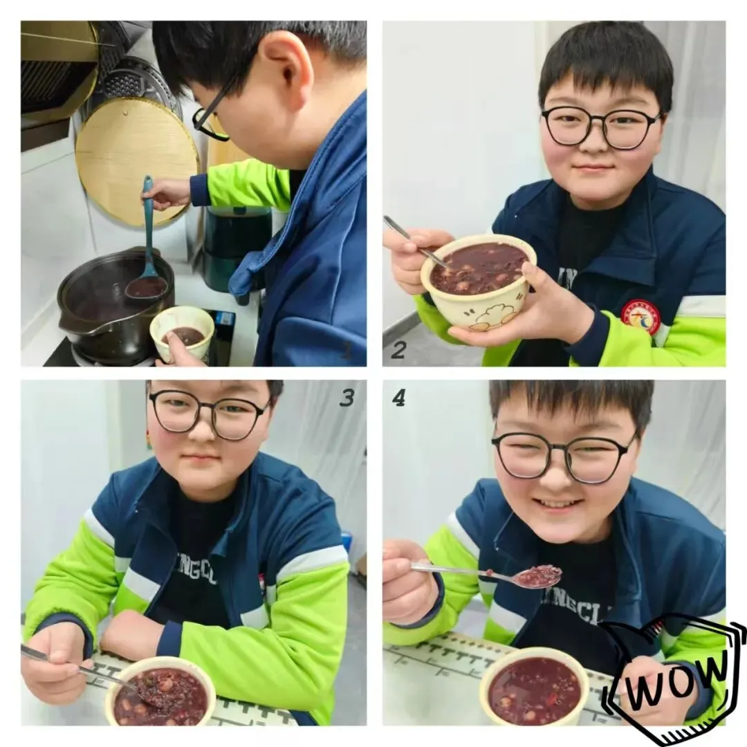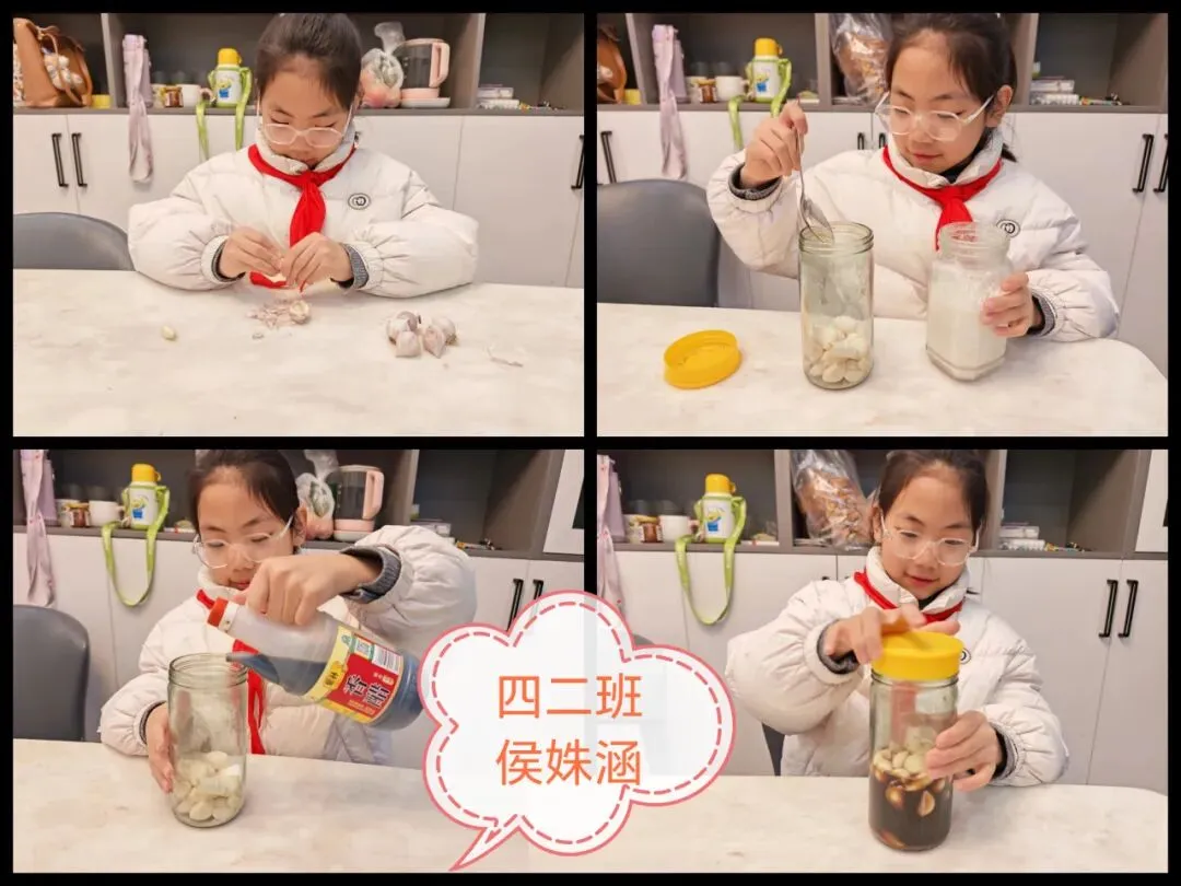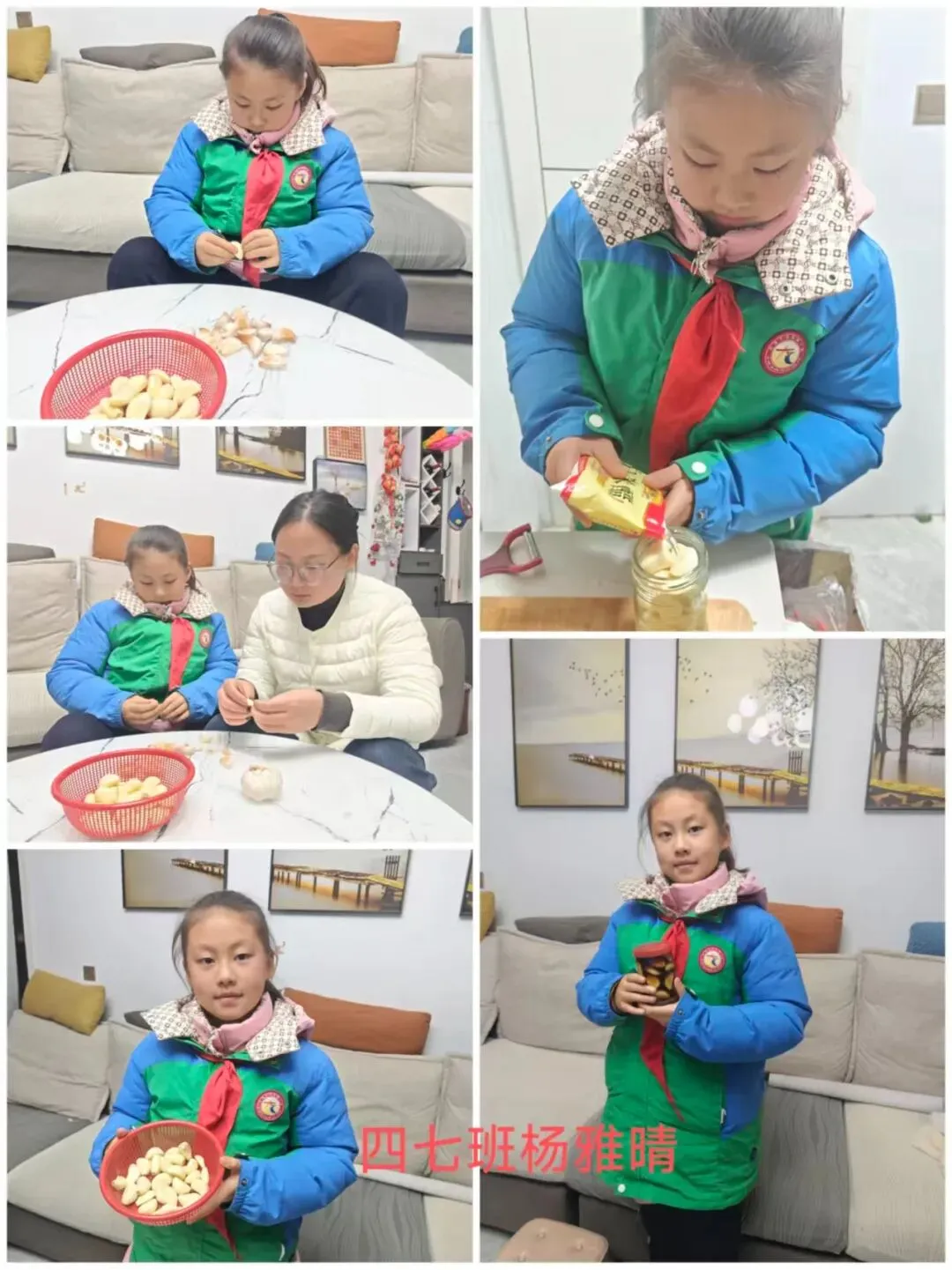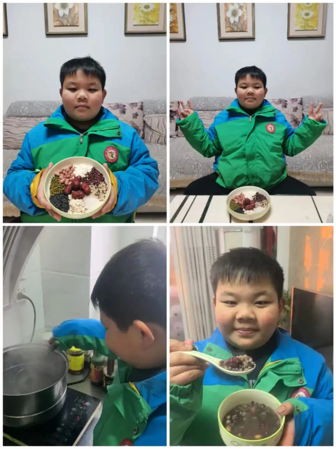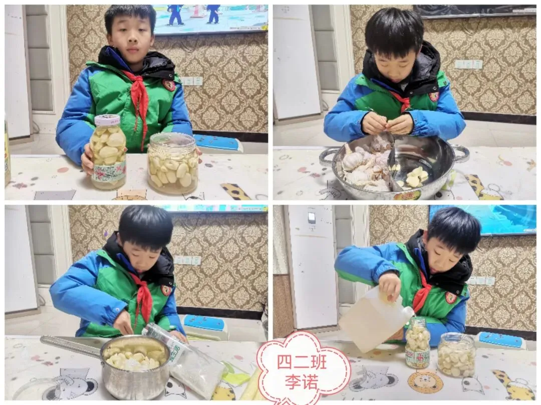 最具烟火气的环节,莫过于亲手腌制腊八蒜、熬制腊八粥。在家长的悉心陪伴与指导下,同学们动手剥蒜、装罐、选材、淘洗,全程参与制作过程。当一罐罐腊八蒜逐渐成形,当一锅锅腊八粥温暖满屋,同学们在劳动中体会了传统美食的制作乐趣,更在与家人协作、分享的过程中,深深感受到亲情的浓郁与节日的温馨。