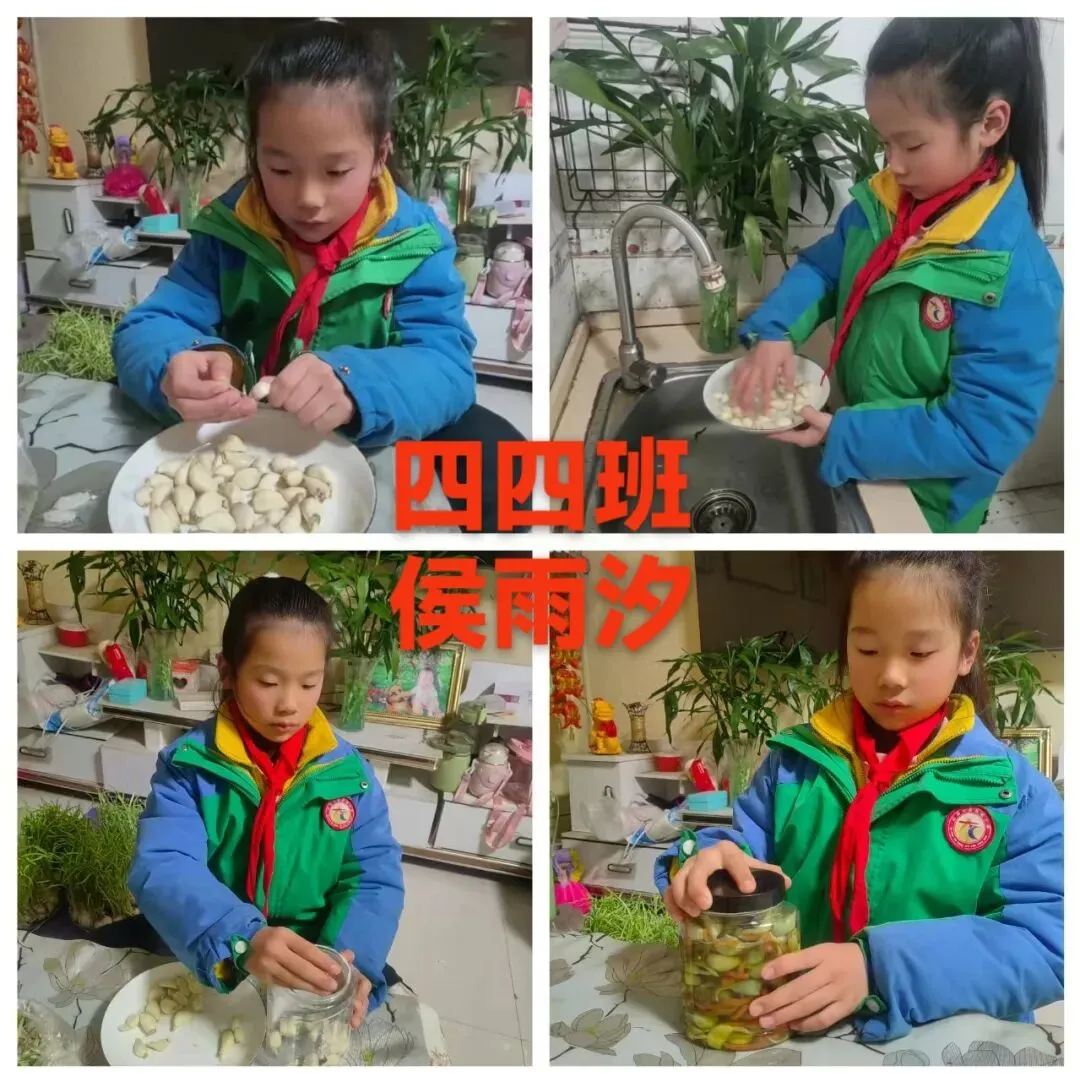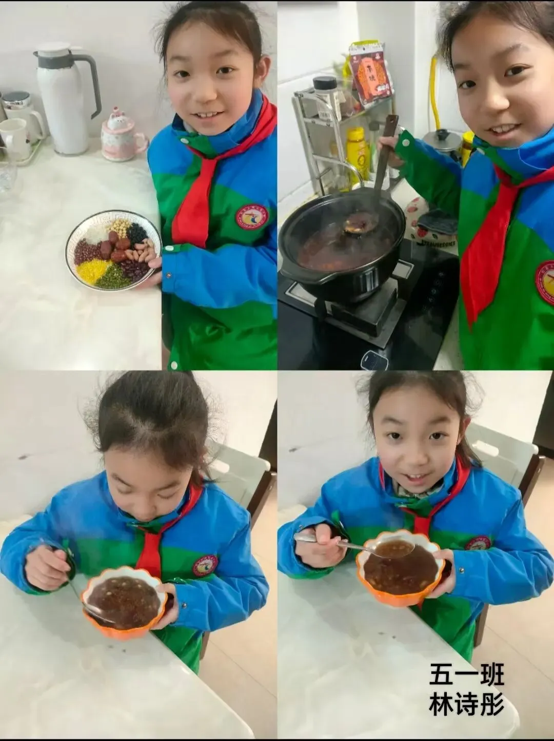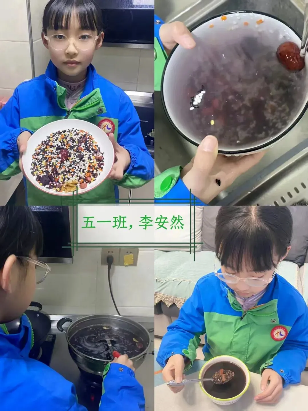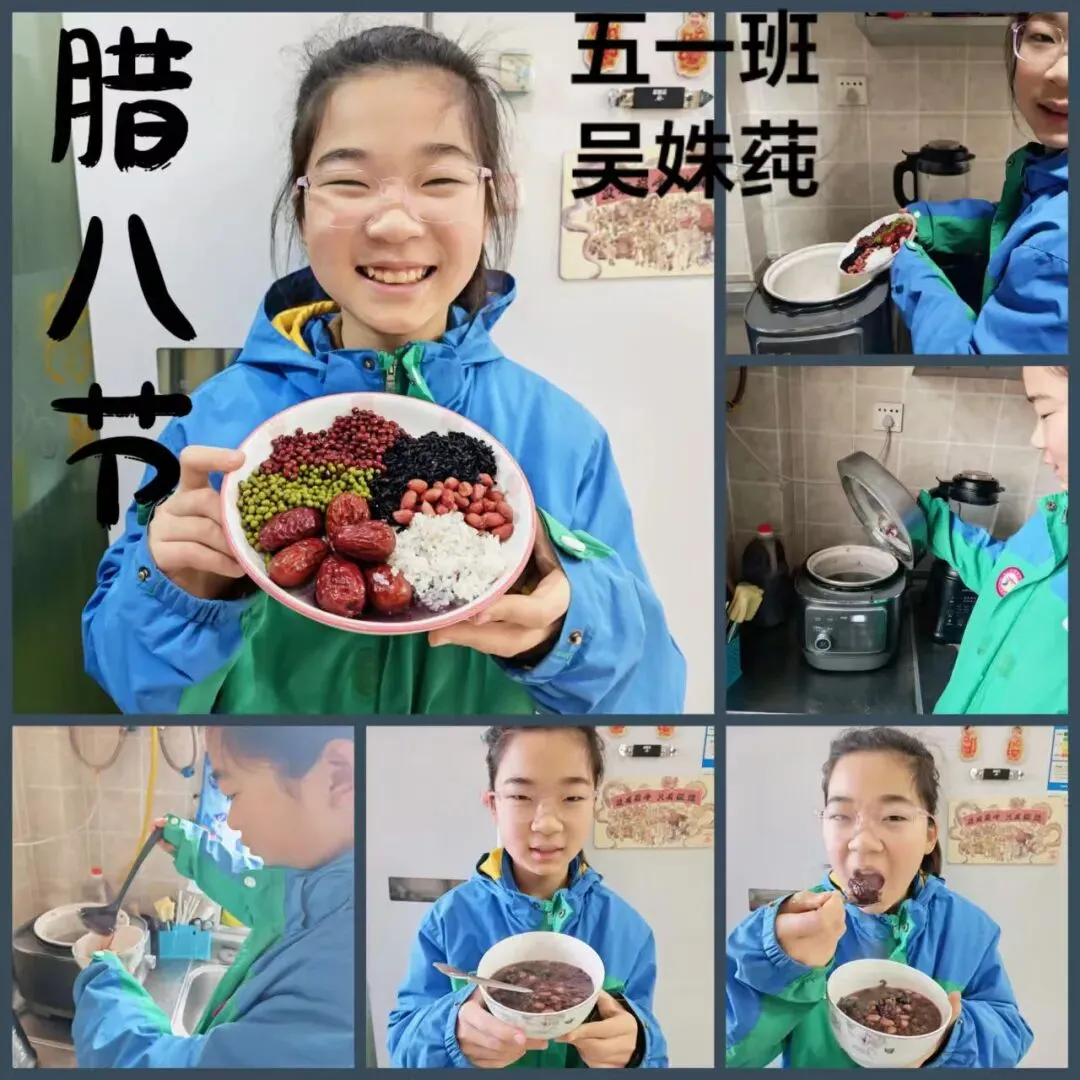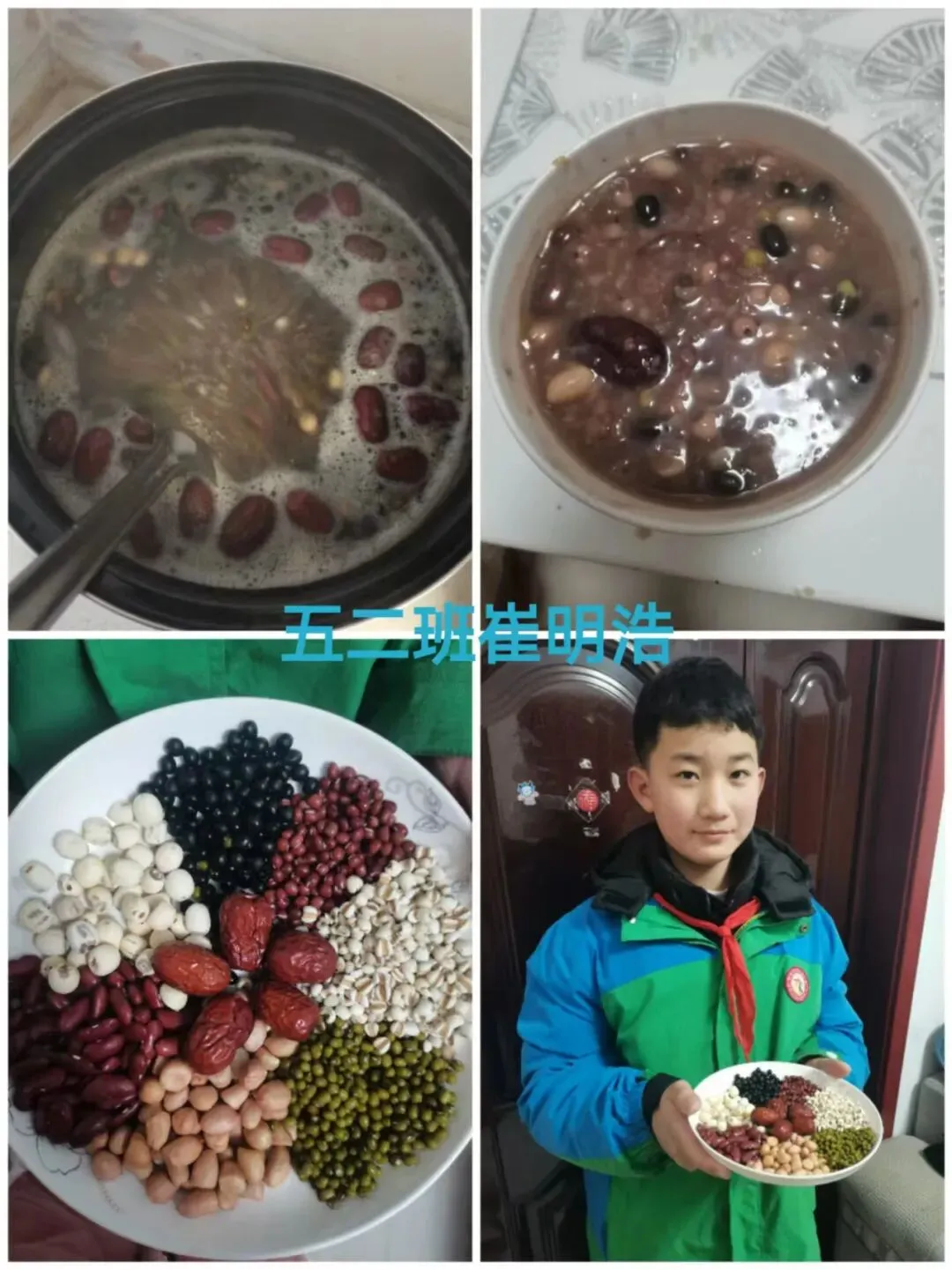 最具烟火气的环节,莫过于亲手腌制腊八蒜、熬制腊八粥。在家长的悉心陪伴与指导下,同学们动手剥蒜、装罐、选材、淘洗,全程参与制作过程。当一罐罐腊八蒜逐渐成形,当一锅锅腊八粥温暖满屋,同学们在劳动中体会了传统美食的制作乐趣,更在与家人协作、分享的过程中,深深感受到亲情的浓郁与节日的温馨。