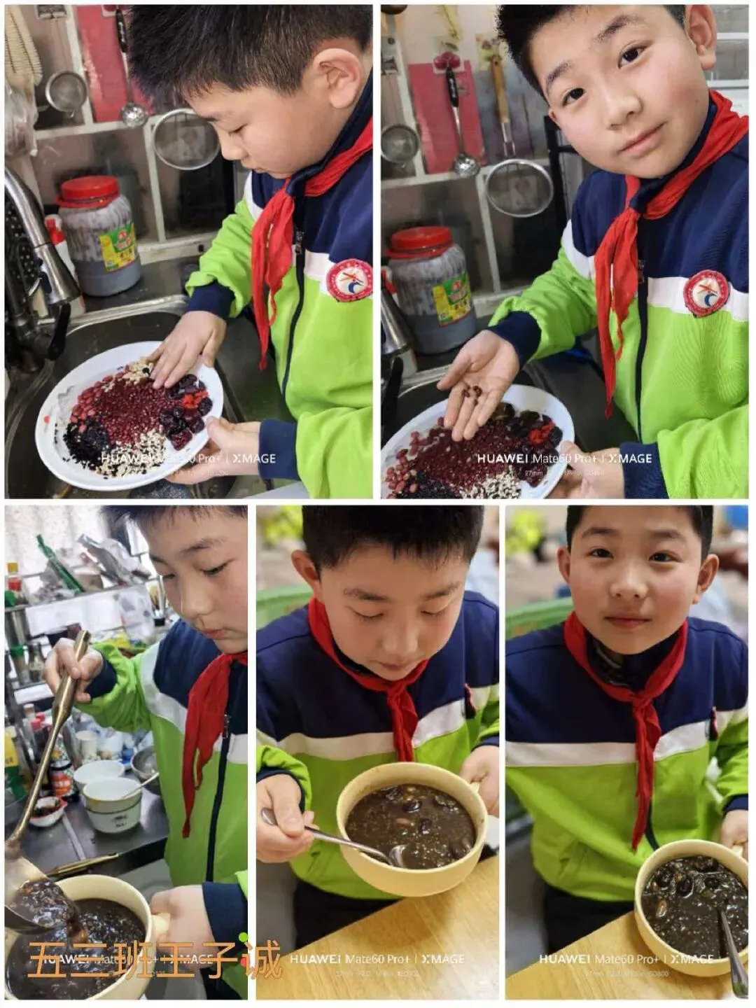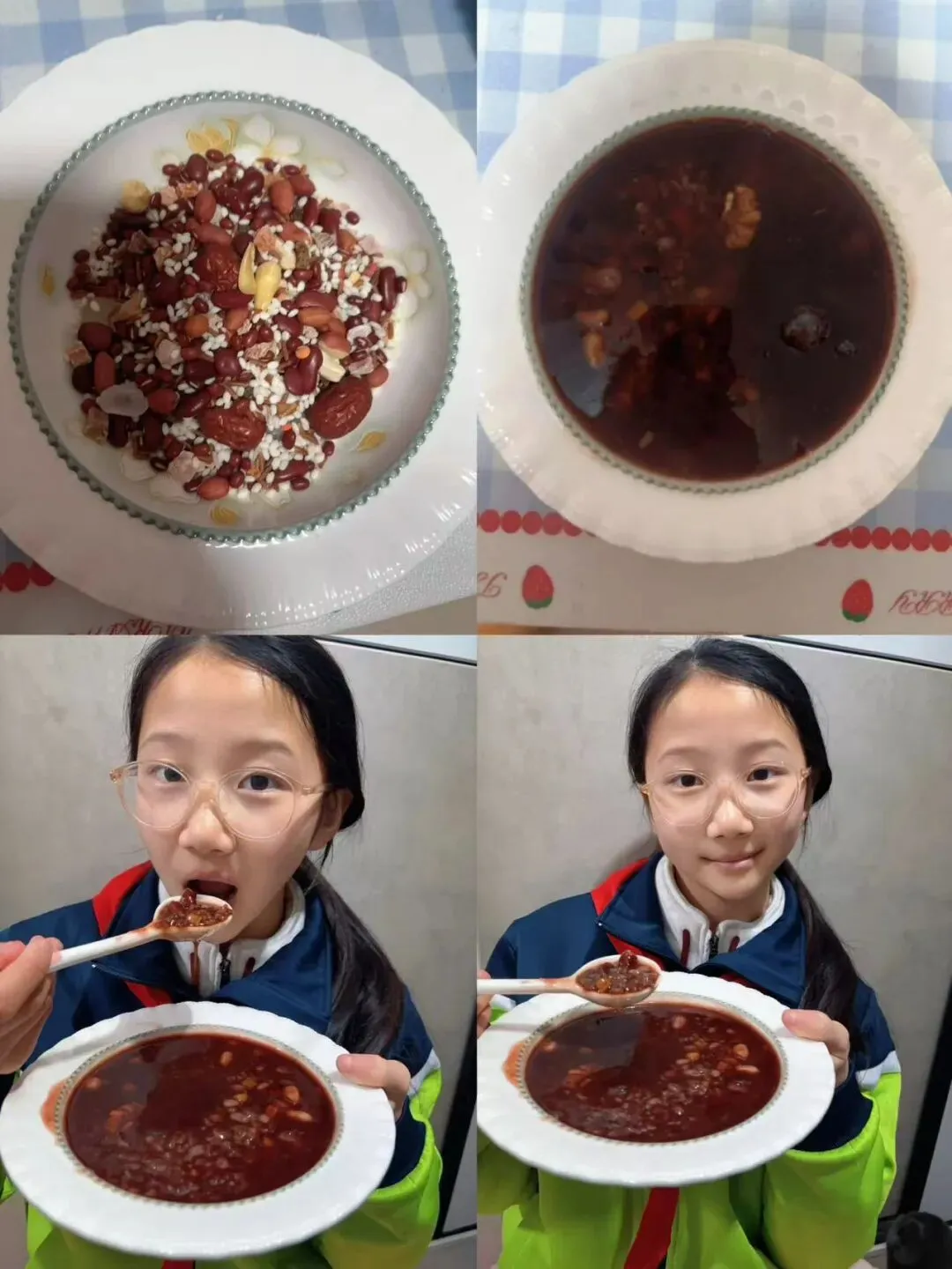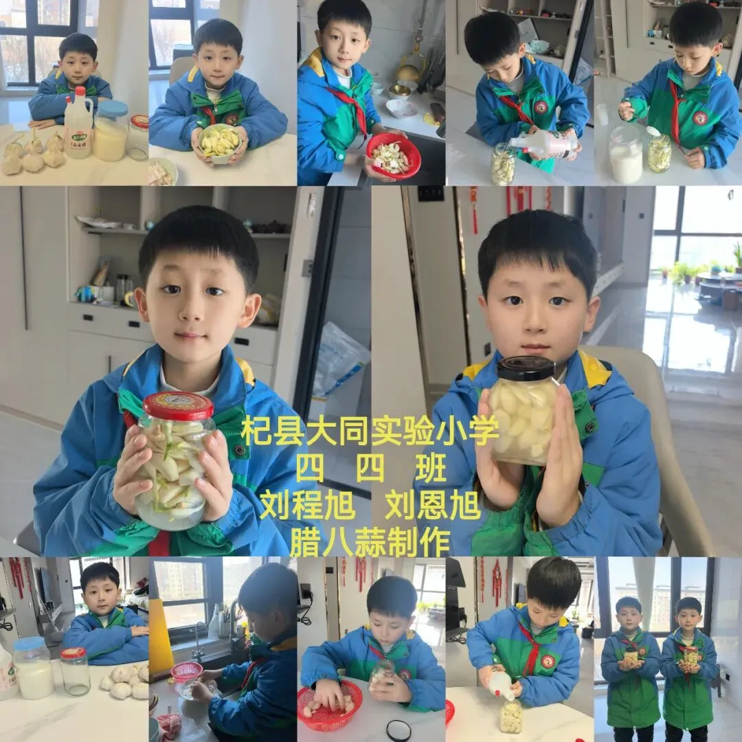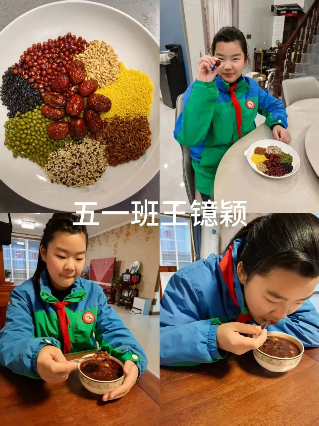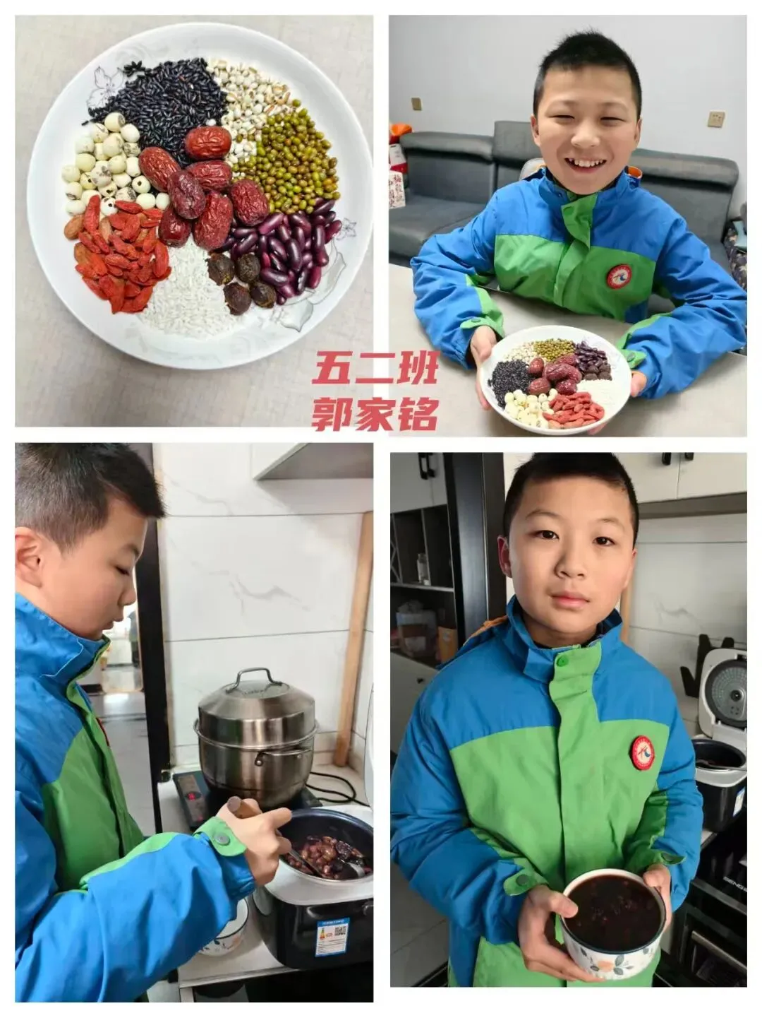 最具烟火气的环节,莫过于亲手腌制腊八蒜、熬制腊八粥。在家长的悉心陪伴与指导下,同学们动手剥蒜、装罐、选材、淘洗,全程参与制作过程。当一罐罐腊八蒜逐渐成形,当一锅锅腊八粥温暖满屋,同学们在劳动中体会了传统美食的制作乐趣,更在与家人协作、分享的过程中,深深感受到亲情的浓郁与节日的温馨。