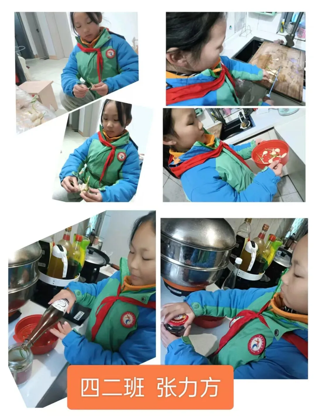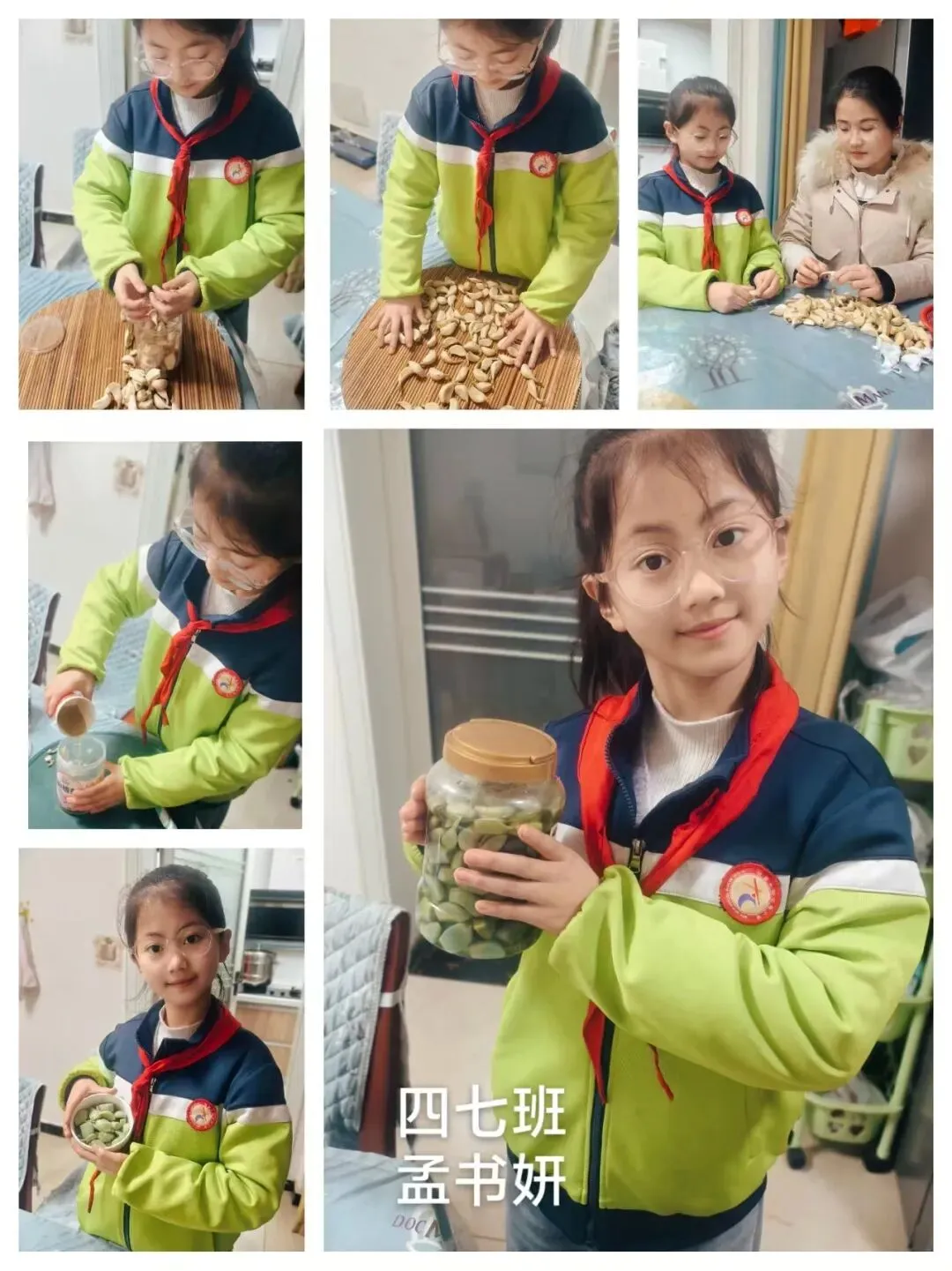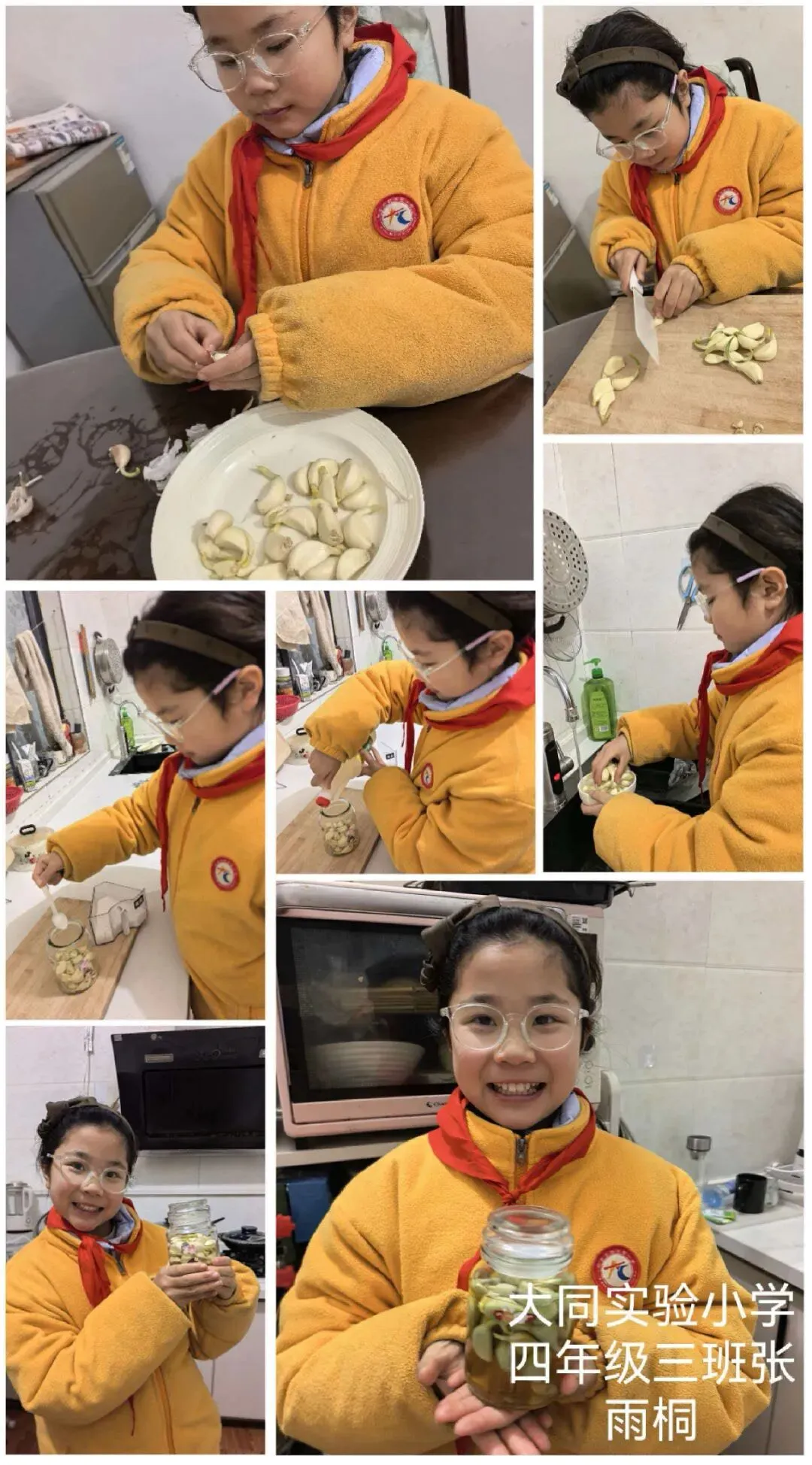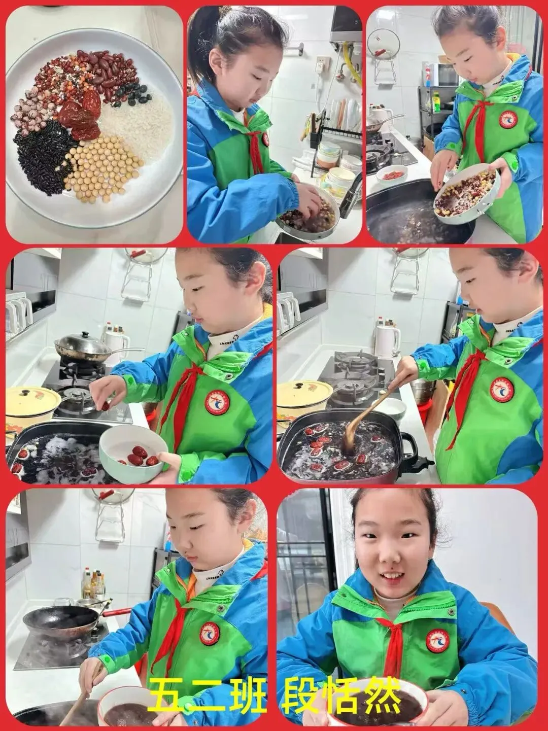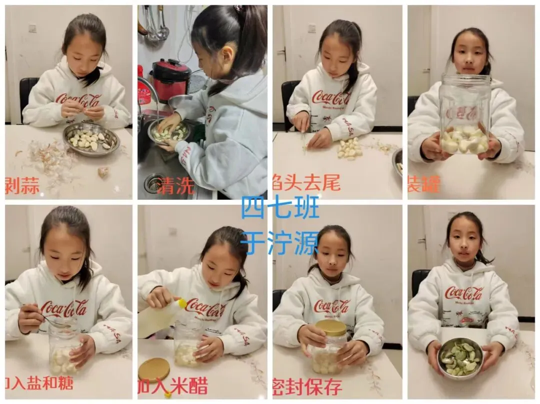 最具烟火气的环节,莫过于亲手腌制腊八蒜、熬制腊八粥。在家长的悉心陪伴与指导下,同学们动手剥蒜、装罐、选材、淘洗,全程参与制作过程。当一罐罐腊八蒜逐渐成形,当一锅锅腊八粥温暖满屋,同学们在劳动中体会了传统美食的制作乐趣,更在与家人协作、分享的过程中,深深感受到亲情的浓郁与节日的温馨。