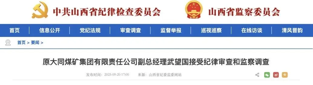 原大同煤矿集团有限责任公司副总经理武望国涉嫌严重违纪违法,目前正接受省纪委监委纪律审查和监察调查。
