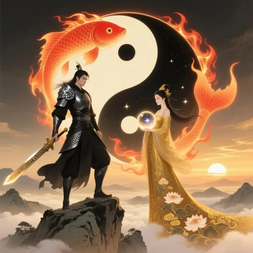 神男化作伏羲。女娲以母爱的大地之力创造生灵,创造了人类。伏羲以父爱的天道之力,引领人类领悟大自然的奥妙,探索生命的意义。灵魂的归途,即是天道所指,众生需好些参详。