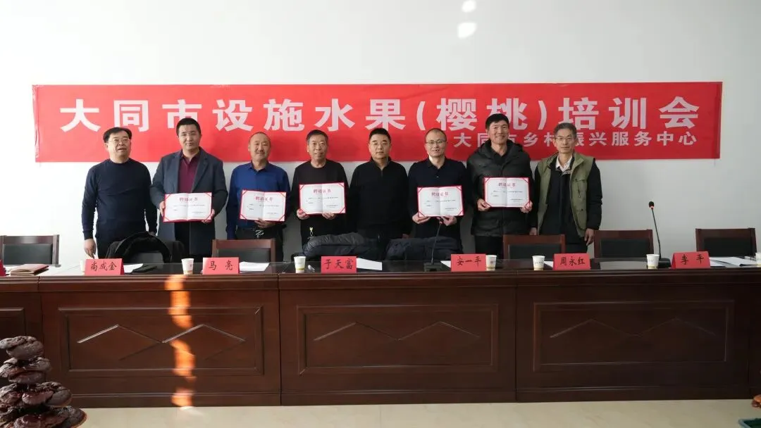 为切实提升设施樱桃种植技术水平与产业经营能力,推动大同市设施水果产业高质量发展,1月26日,大同市乡村振兴服务中心在森海食用菌种植专业合作社召开大同市设施水果(樱桃)培训会,并为部分种植能手和种植基地颁发特聘专家证书和联系服务牌匾。